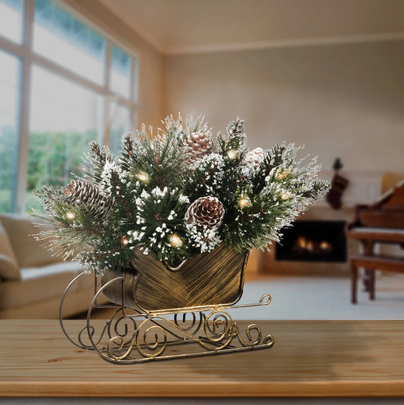 - Includes one metal Sleigh with Christmas Greenery, flocked red berries, flocked pine cones and flocked branches , measuring 10 inches in height.