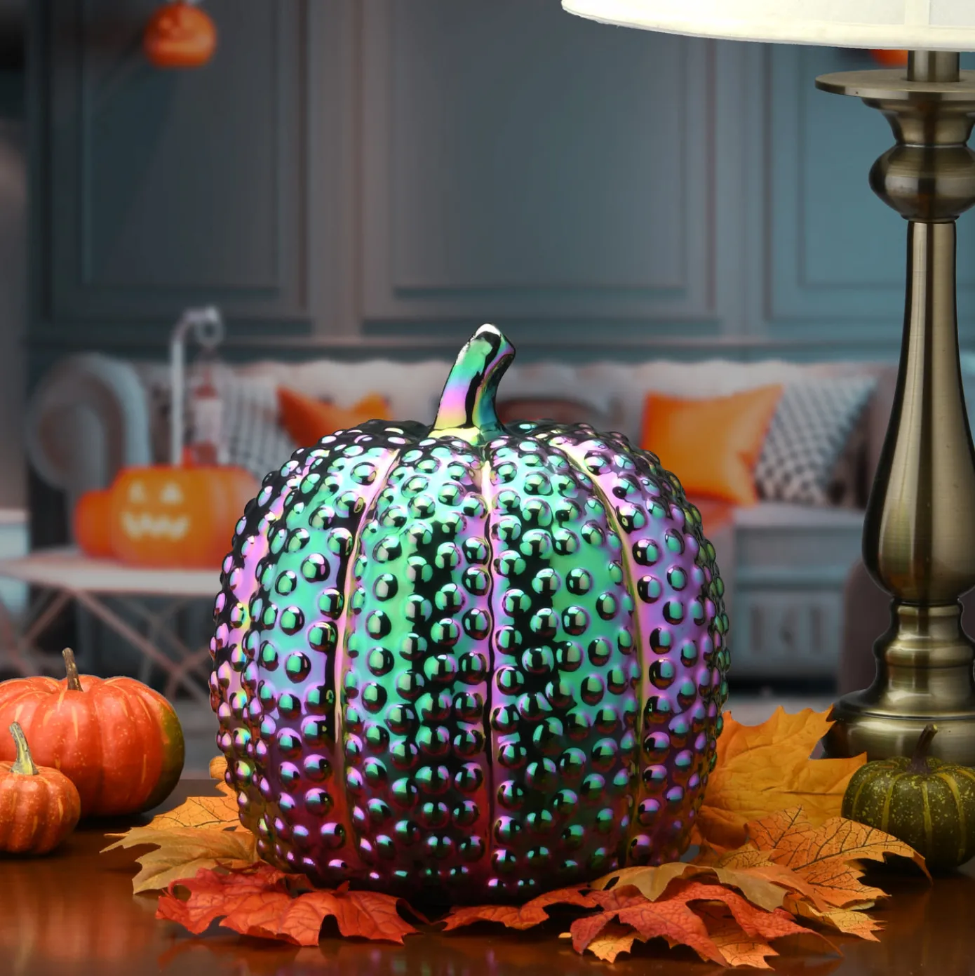 - Halloween themed decorative statue depicting an iridescent pumpkin.