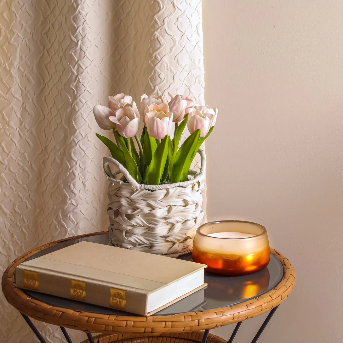 This tight bouquet of pink tulip blooms with tall leafy stems rises from a white basket with a wide weave and two loop handles. The flowers are seated in a simulated soil surface. Add a burst of color to tabletop trimmings with these attractive artificial flowers that are remarkably life-like yet maintenance-free. For decorative indoor display.