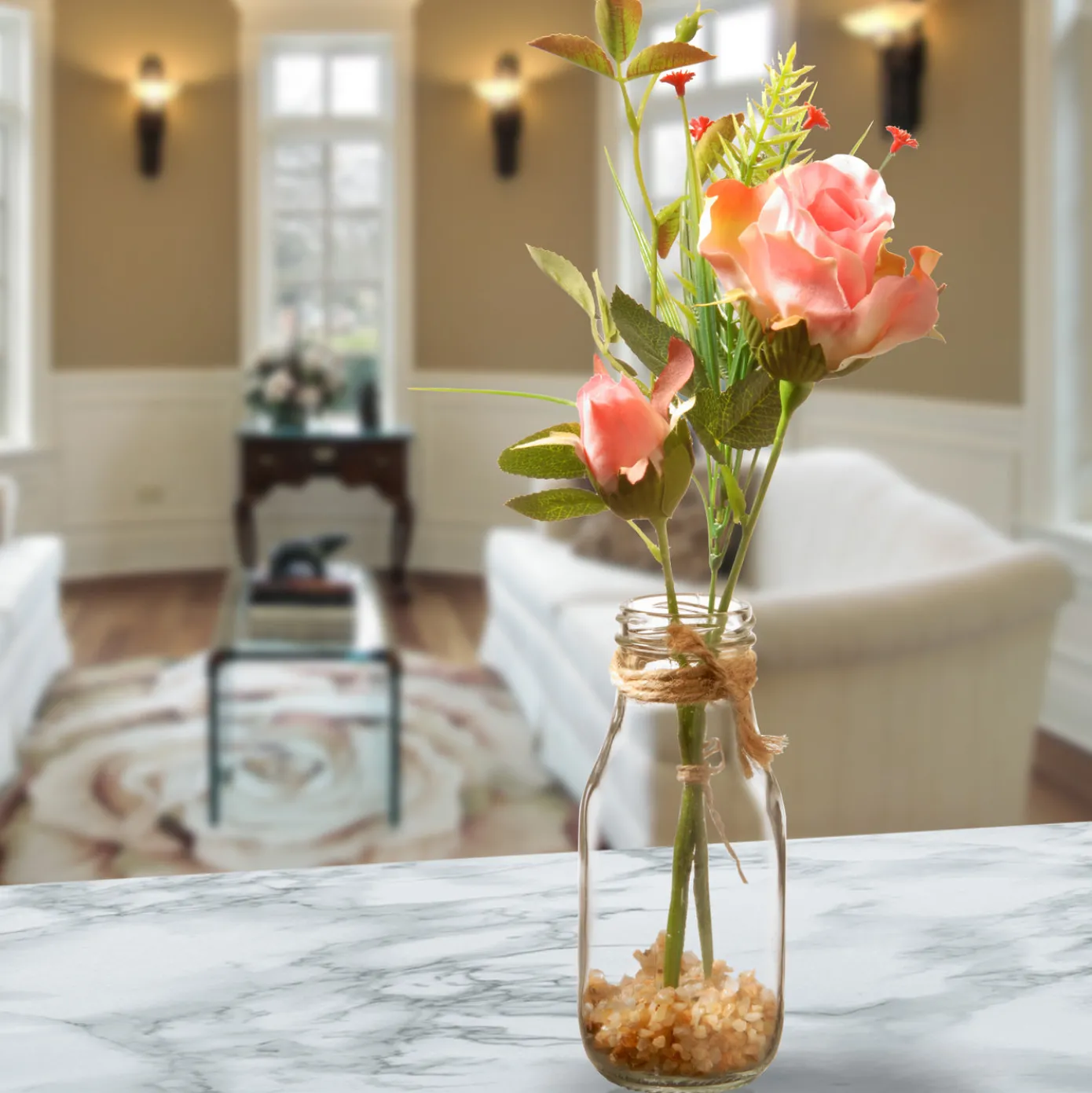 - Includes one Artificial Flower Bouquet in Glass Vase that measures 12 inches in height, is filled with large, pink roses and includes sprigs, leaves and stems in a charming glass vase with a pebble base.