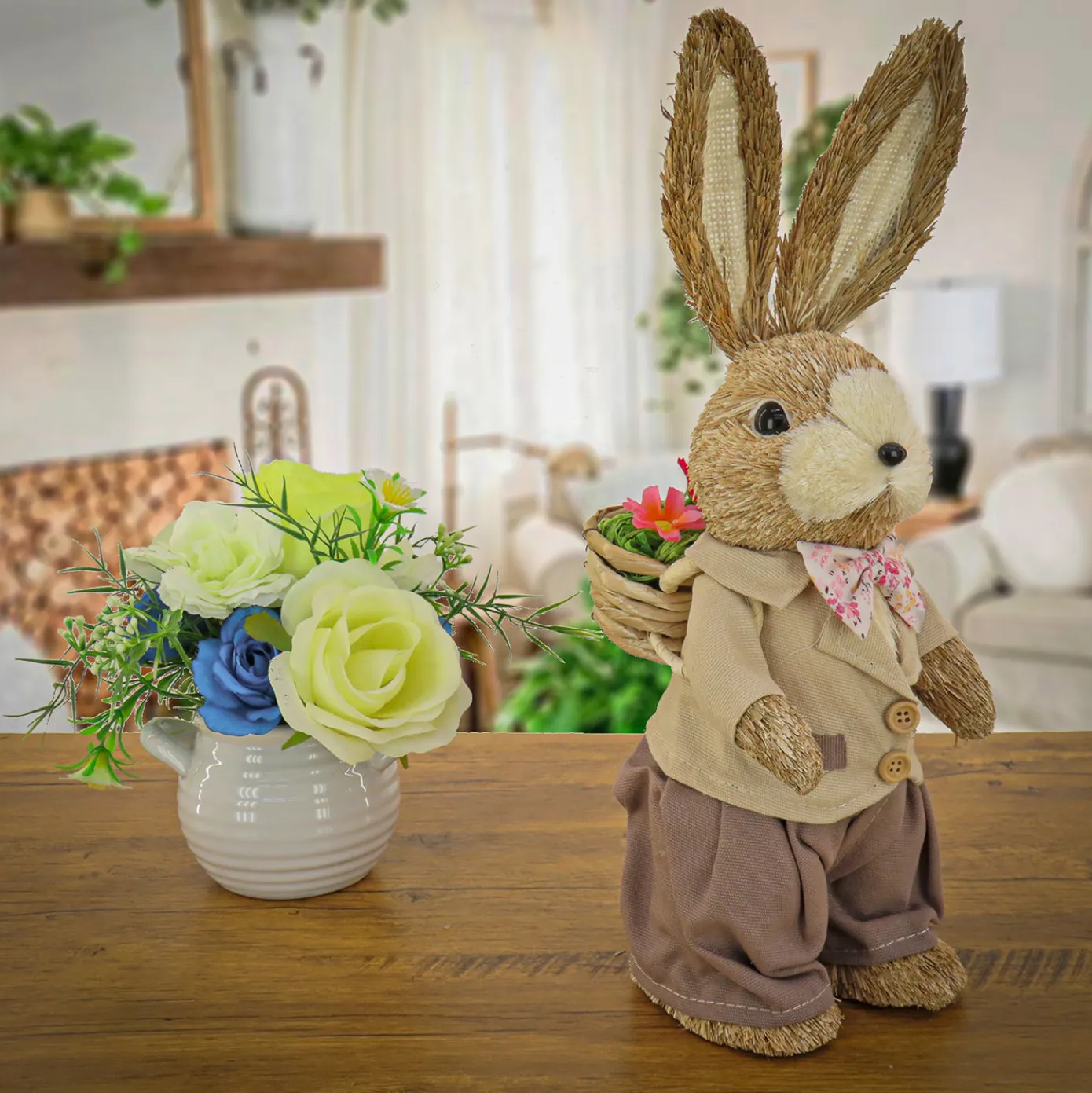 - This table decoration features a boy bunny dressed for the Easter holiday in his slacks, sport coat and floral bowtie while he carries a basket full of thick greenery topped with pink flower blooms on his back