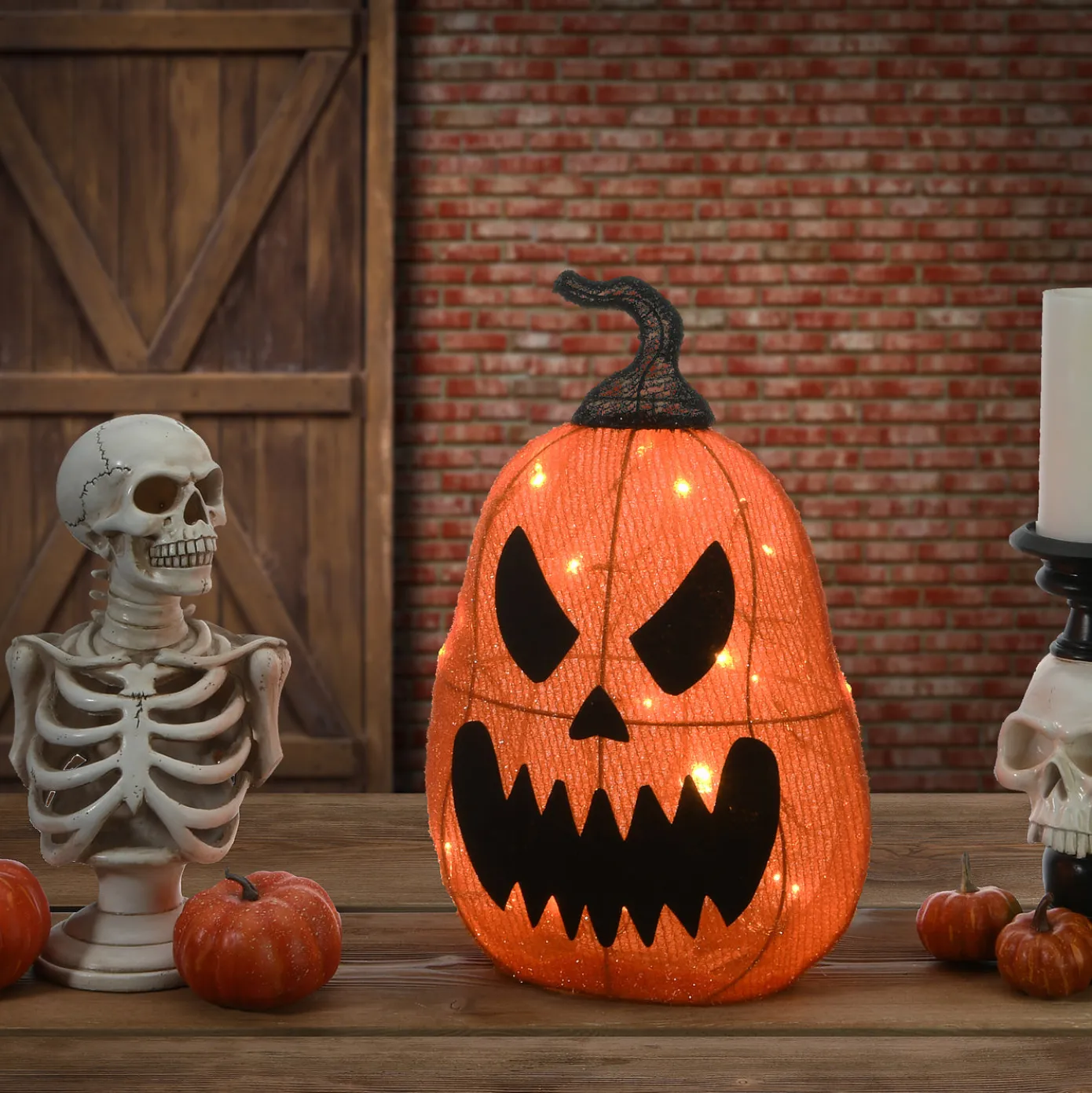 - Halloween themed outdoor decoration depicting a menacing Jack O’ Lantern. 25 warm, white LED lights outlines the frame of the pumpkin.