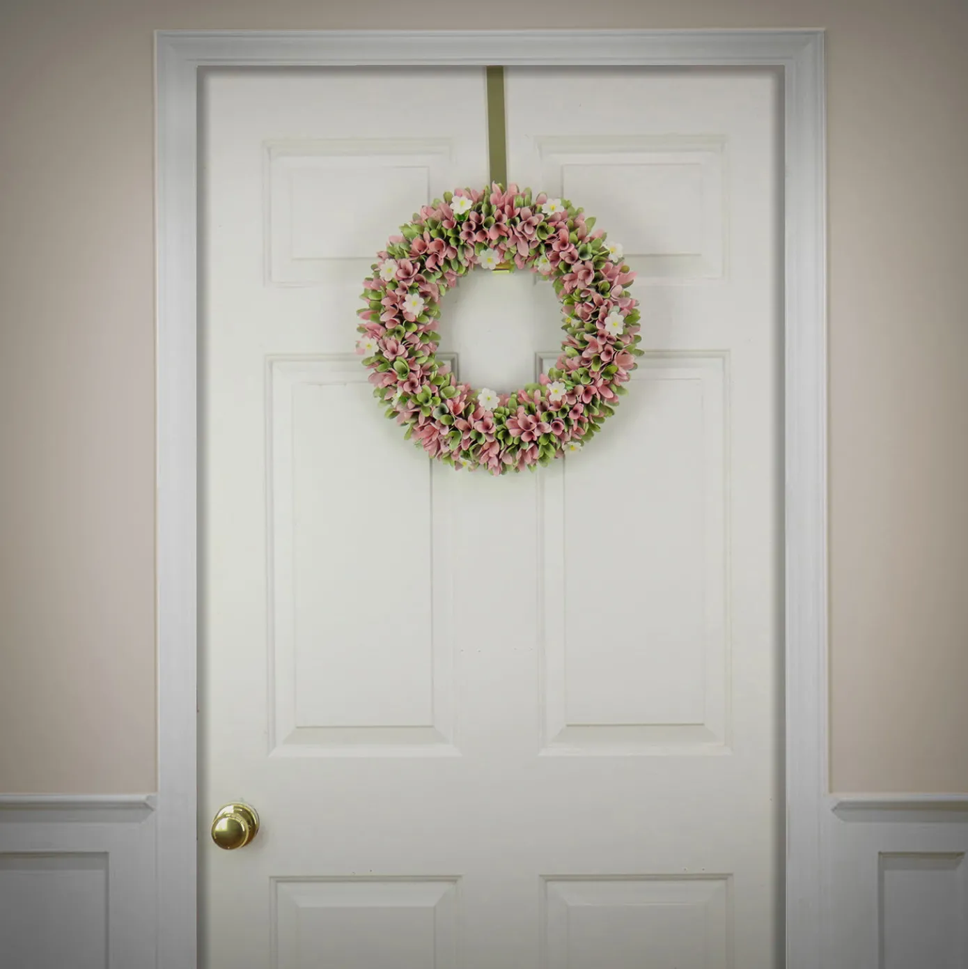 - This artificial wreath decoration is decorated with pink and green assorted wood cut flowers and flowing green leaves