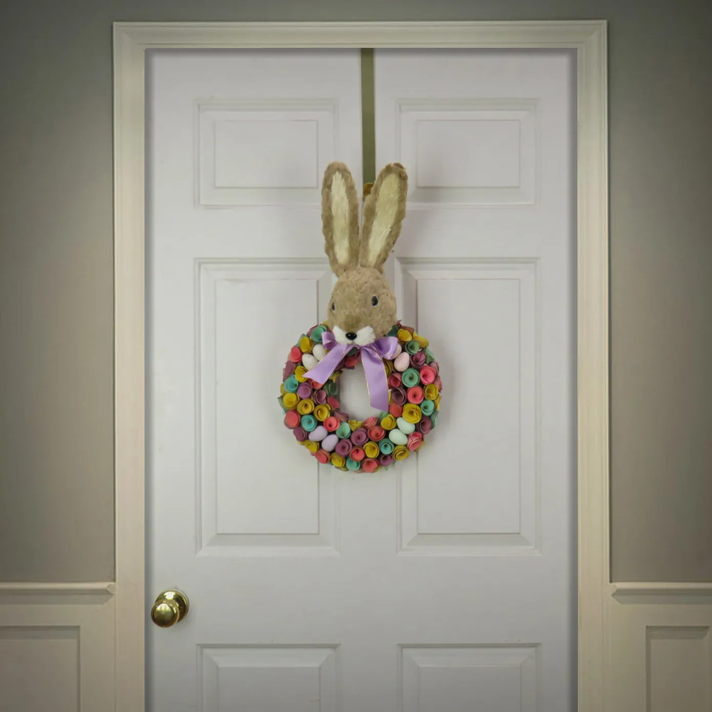 - ARTIFICIAL EASTER WREATH: An expertly crafted faux Easter wreath featuring colorful flower blooms made from curls of wood, pastel eggs, a decorative ribbon, and an adorable bunny head, creating a welcoming and festive ambiance. This wreath is designed with a sturdy foam base, ensuring durability and a secure structure.