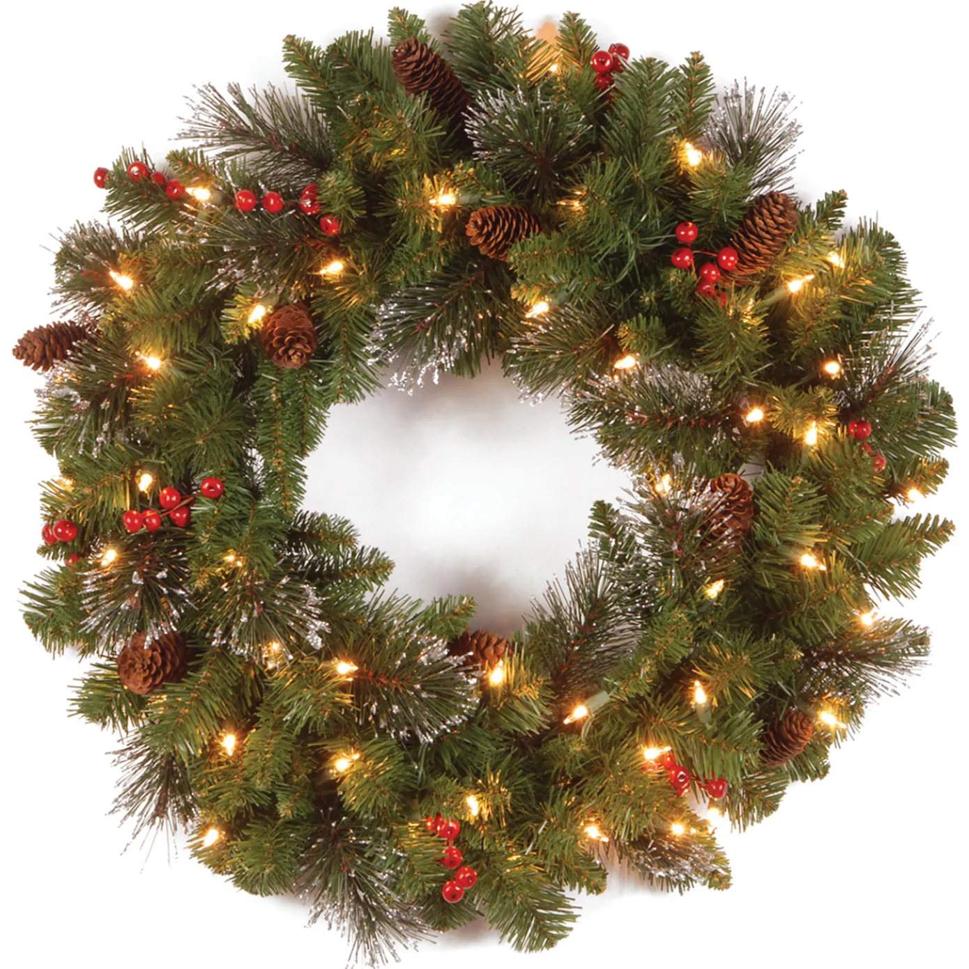 The Crestwood Spruce is a sparkling mixed branch wreath featuring bristle tips and trimmed with pine cones, red berries and glitter. It is pre-strung with 50 clear lights that remain lit even if a bulb burns out. This wreath can be displayed on doors, walls and windows in indoor or covered outdoor locations. Plug In.