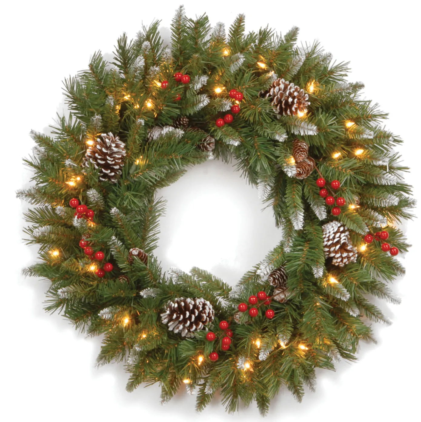 The Frosted Berry wreath features branch tips and pine cones that are touched with frosting to create the look of fresh fallen snow while groups of red berries add color and warmth. It is pre-strung with 50 clear lights that remain lit even if a bulb burns out. Display this wreath on doors, walls and windows in indoor or outdoor locations.