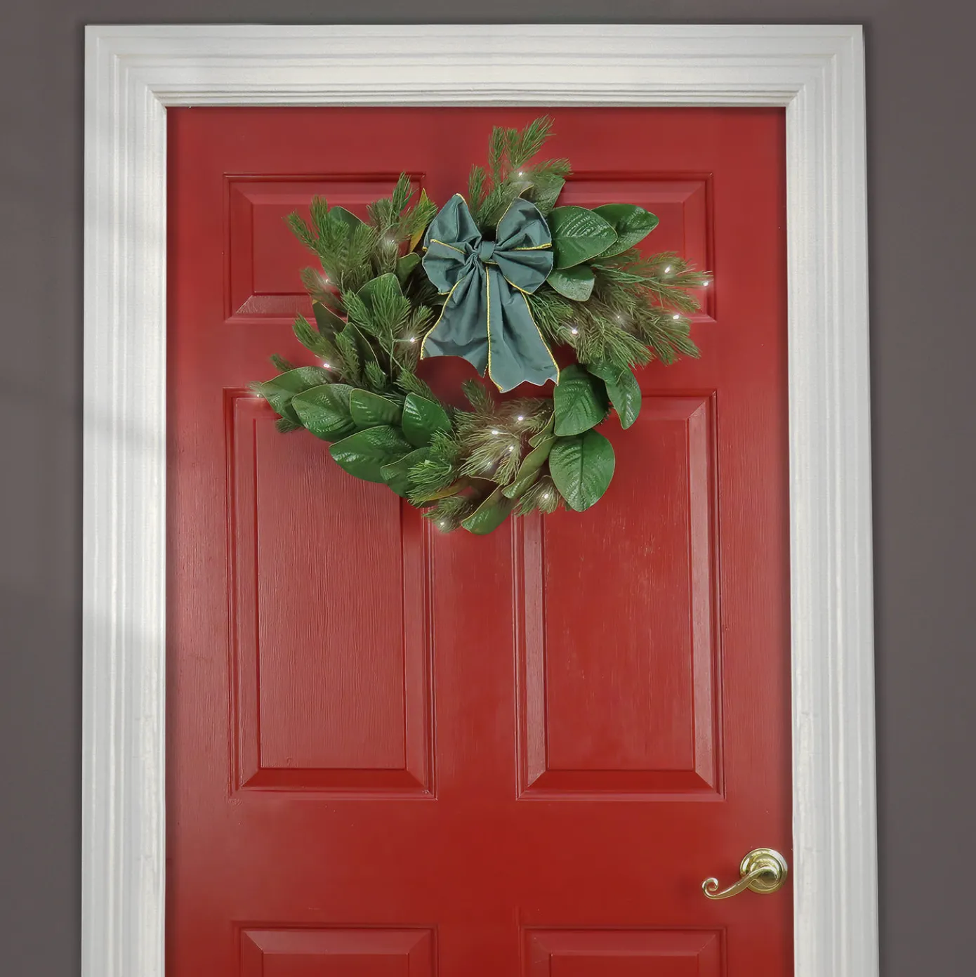 Bring the holiday cheer into your home with this 24 inch Christmas Magnolia Mix Pine Wreath. Decorated with a fabric bow and pre-lit with 50 warm white LED lights with remote control, this wreath is perfect for any entryway or fireplace mantel.