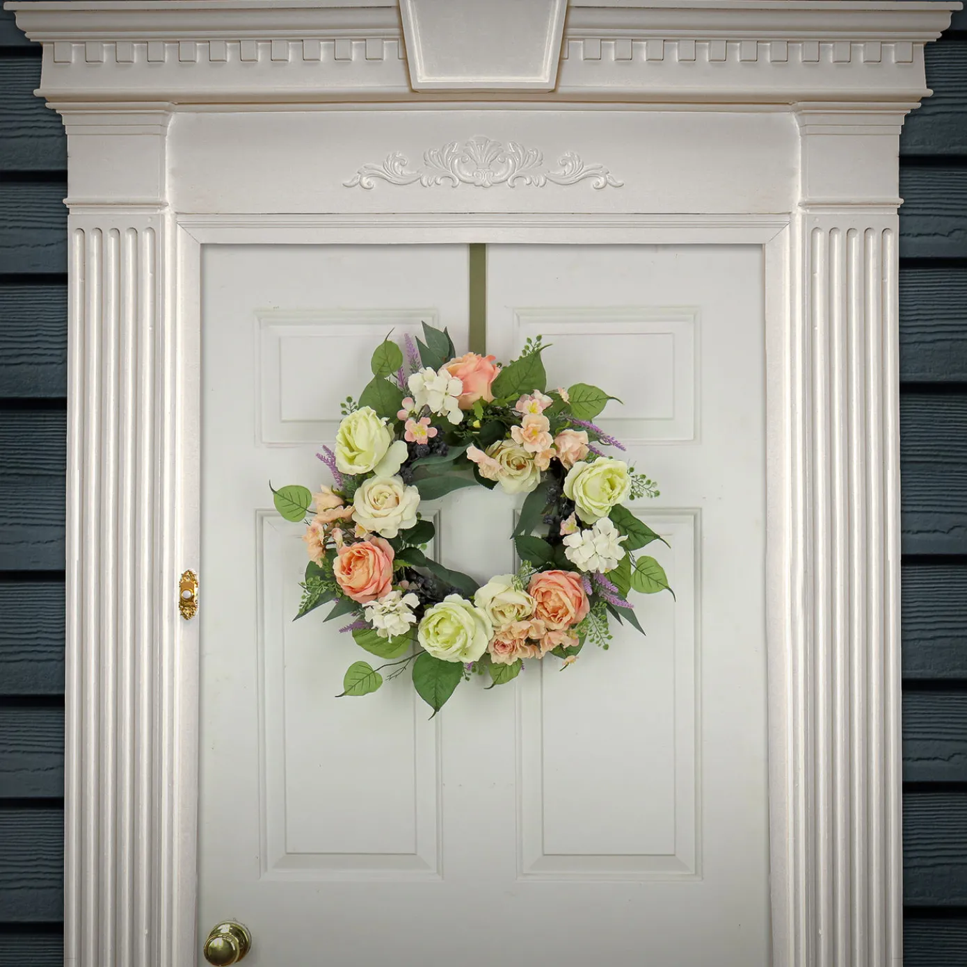 Introducing the National Tree Company 24 inch Spring Wreath. This elegant and eye-catching floral front door wreath combines realistic rose and peony blooms with lush leafy greens to create a fresh and welcoming touch for your home. This spring floral wreath captures the essence of the season with its realistic textures, rich colors, and natural design, making it an excellent choice for both indoor and covered outdoor spaces. Whether hung on your front door to greet guests or displayed as a stunning centerpiece indoors, this wreath effortlessly adds a welcoming touch that complements any décor style. Its versatility makes it perfect for decorating entryways, living rooms, or even office spaces, offering a fresh, vibrant look wherever it’s placed. Ideal for those who want to add seasonal charm without the upkeep, this wreath brings the essence of spring to your home with minimal effort.