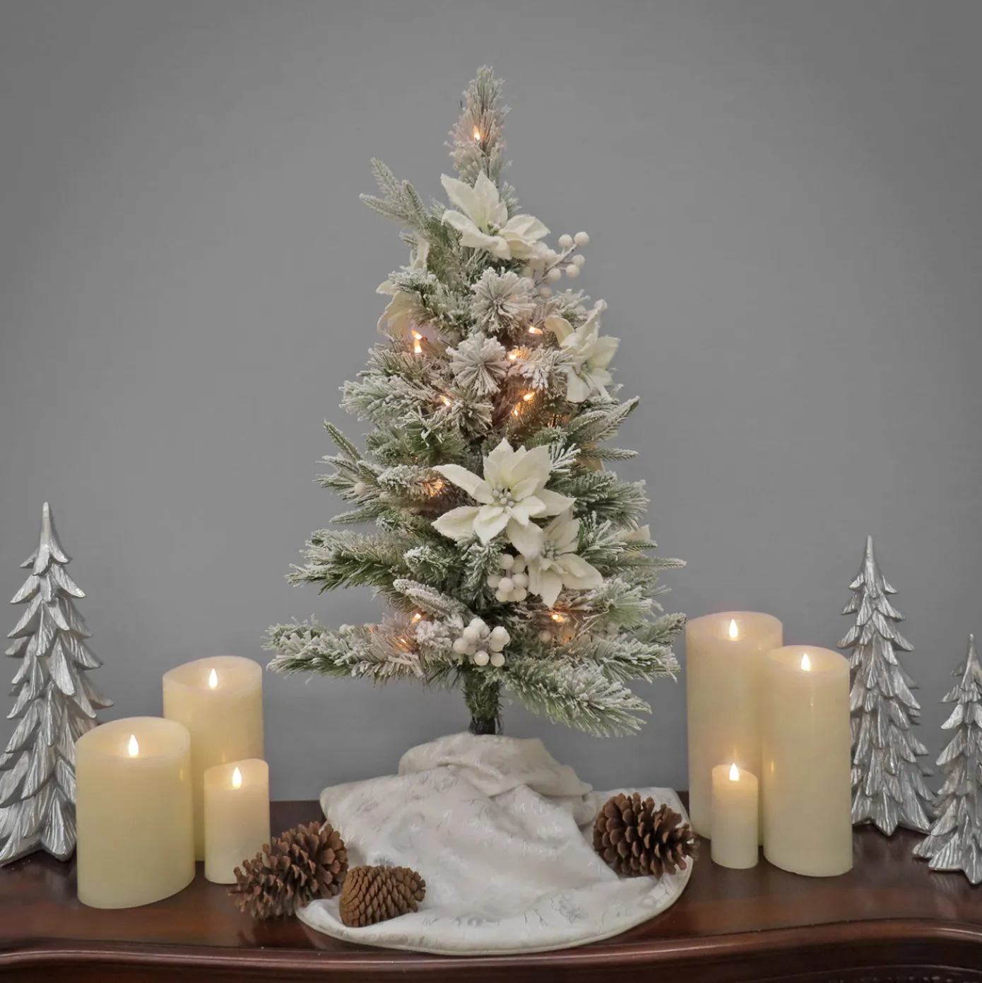 This snow dusted Frosted Colonial Fir Pencil Slim tree features Feel Real branch tip technology, creating a tree with remarkable realism. These crush-resistant branch tips are molded from real tree branches for an authentic living tree appearance. This mixed tip tree is pre-lit with 50 clear lights that remain lit even if a bulb burns out, and is trimmed with white poinsettias and white berries. Crafted with high quality materials and hinged branches for easy set up and includes a sturdy metal folding stand. For indoor display only.