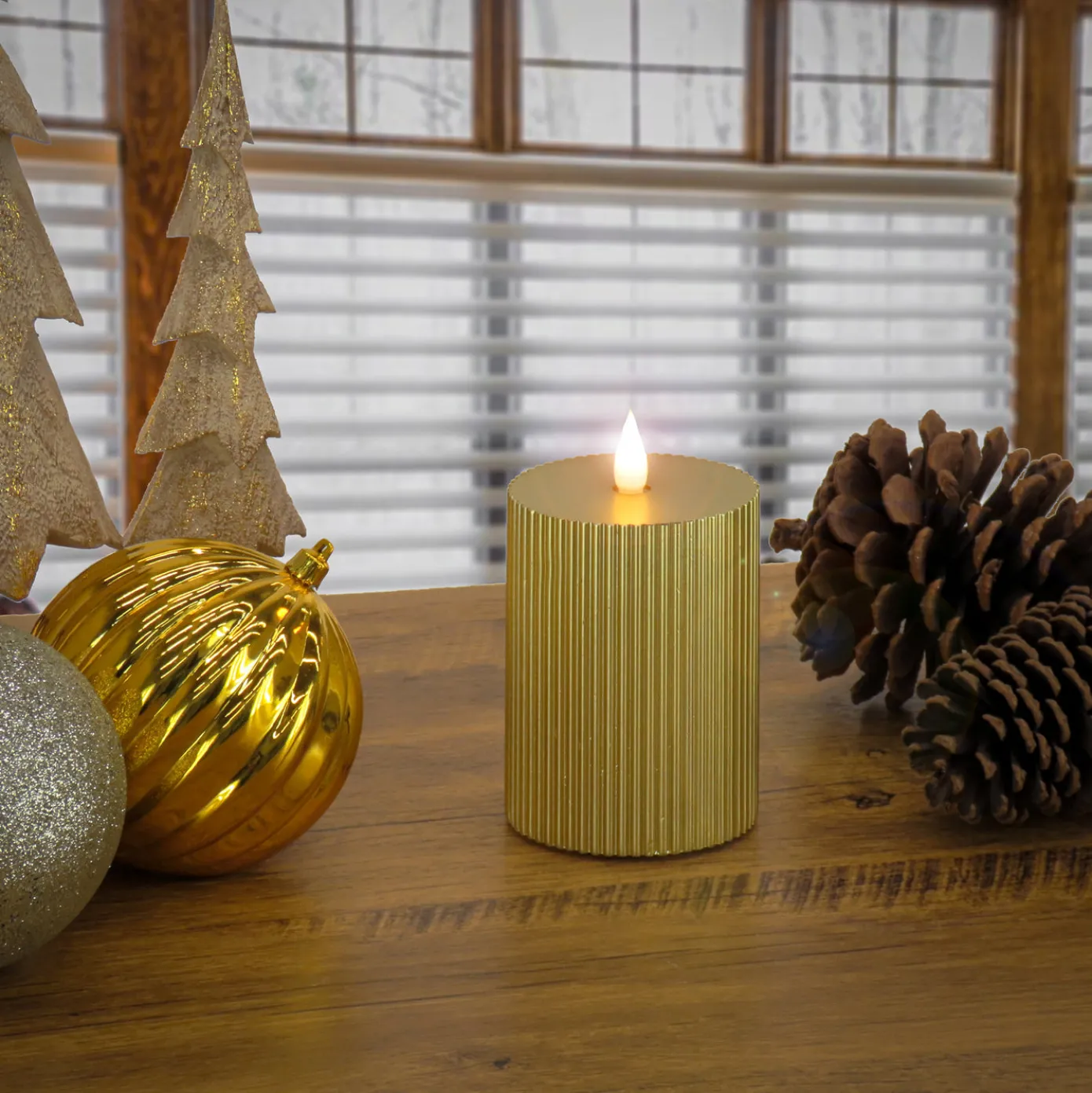 Battery operated with remote controlled functions, this flameless candle produces a realistic, soft, and safe candle glow. The exterior surface is crafted with real wax and features an elegant vertical ridged design in an attractive gold finish. A handheld remote control operates the lifelike candle flame with functions that include brightness, flicker speed, and timer settings. Uses two C size batteries (not included).
