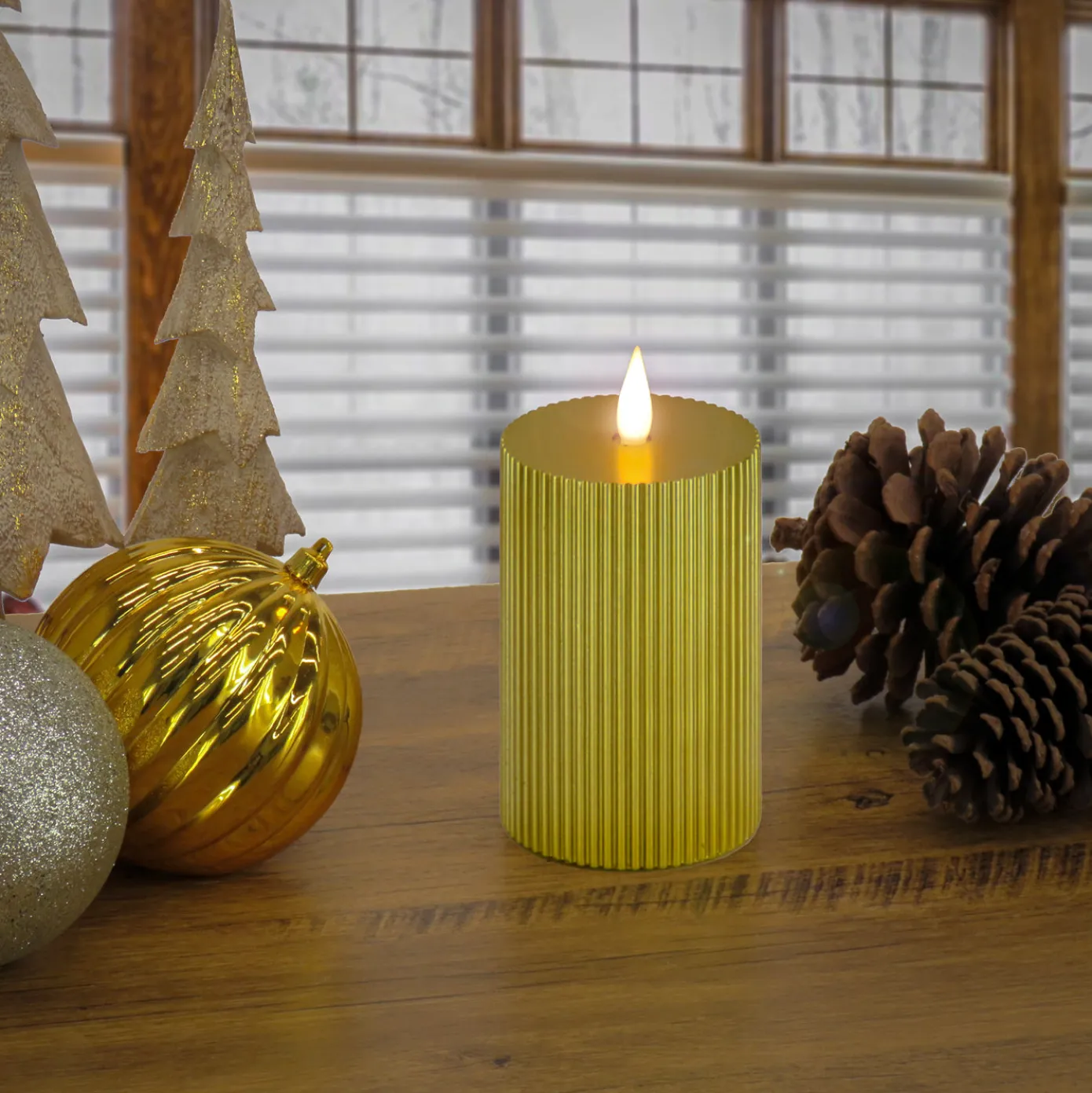 Battery operated with remote controlled functions, this flameless candle produces a a realistic, soft, and safe candle glow. The exterior surface is crafted with real wax and features an elegant vertical ridged design in an attractive gold finish. A handheld remote control operates the lifelike candle flame with functions that include brightness, flicker speed, and timer settings. Uses two C size batteries (not included).