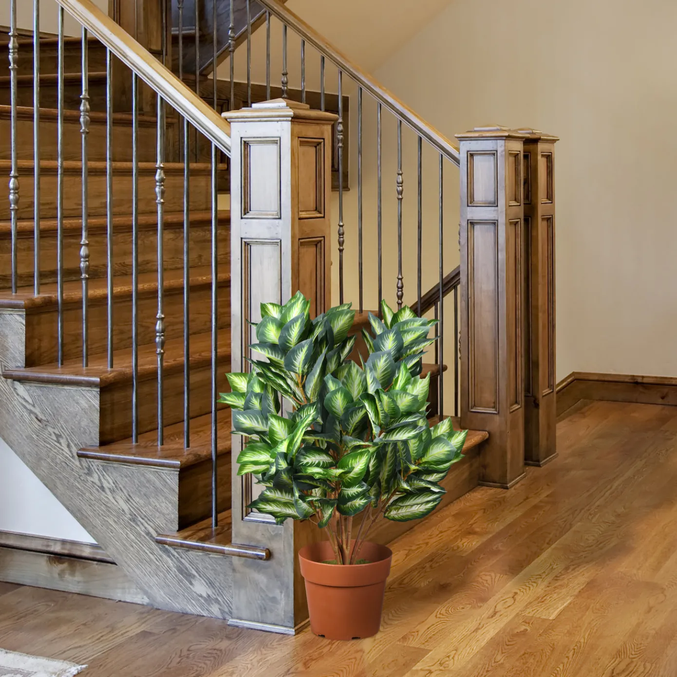 This potted Hosta plant features large tri-colored green leaves on long stems seated in a brown growers pot with simulated soil surface. This artificial plant appears to be living yet requires no maintenance, water or sunlight. Can be displayed in indoor or outdoor locations