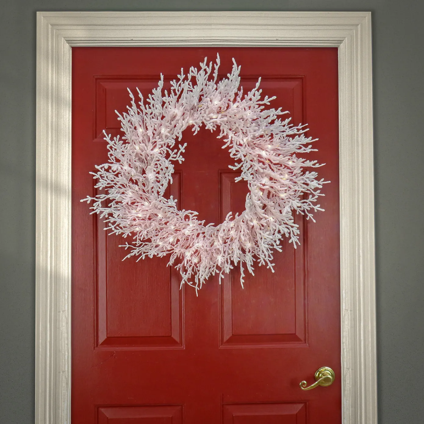 The HGTV Home Collection by National Tree Company Christmas by the Sea Coral wreath features snow flocked branches that give the appearance of soft coral tips. It is pre-lit with 100 battery operated warm white LED lights that are energy-efficient and long lasting. Inlcudes a 6 hours ON/18 hours OFF timed operation. This wreath can be displayed on door, wall, or window in indoor or covered outdoor locations.