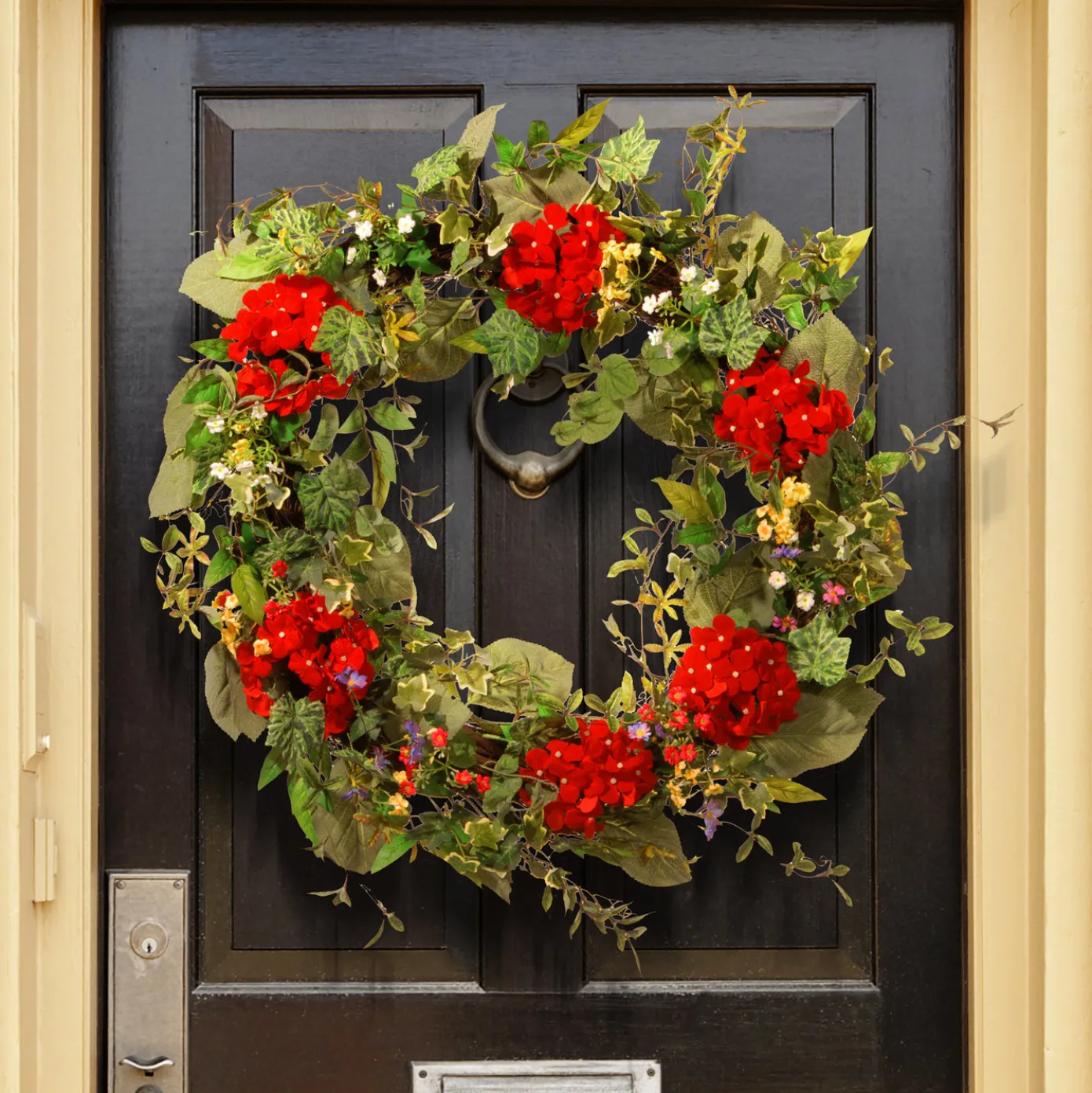 - This spectacularly spring decoration is the perfect complement to any decorative arrangement, featuring large blooms of red hydrangea flowers, seed pods and a swirl of leafy greens.
