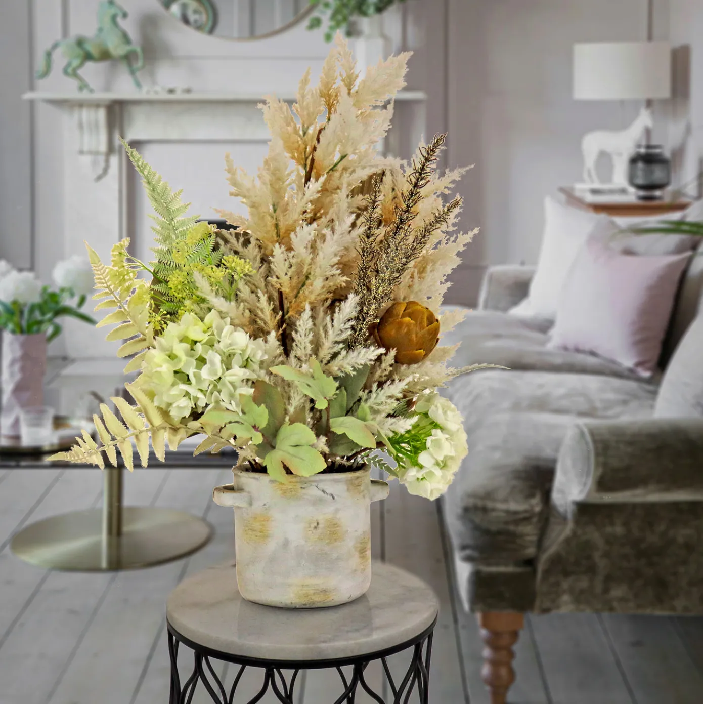 - This artificial potted plant table decoration is decorated with large hydrangea blooms among a blend of leafy greens, flowering stalks, and palm fans in a mixture of green, beige, and ivory tones
