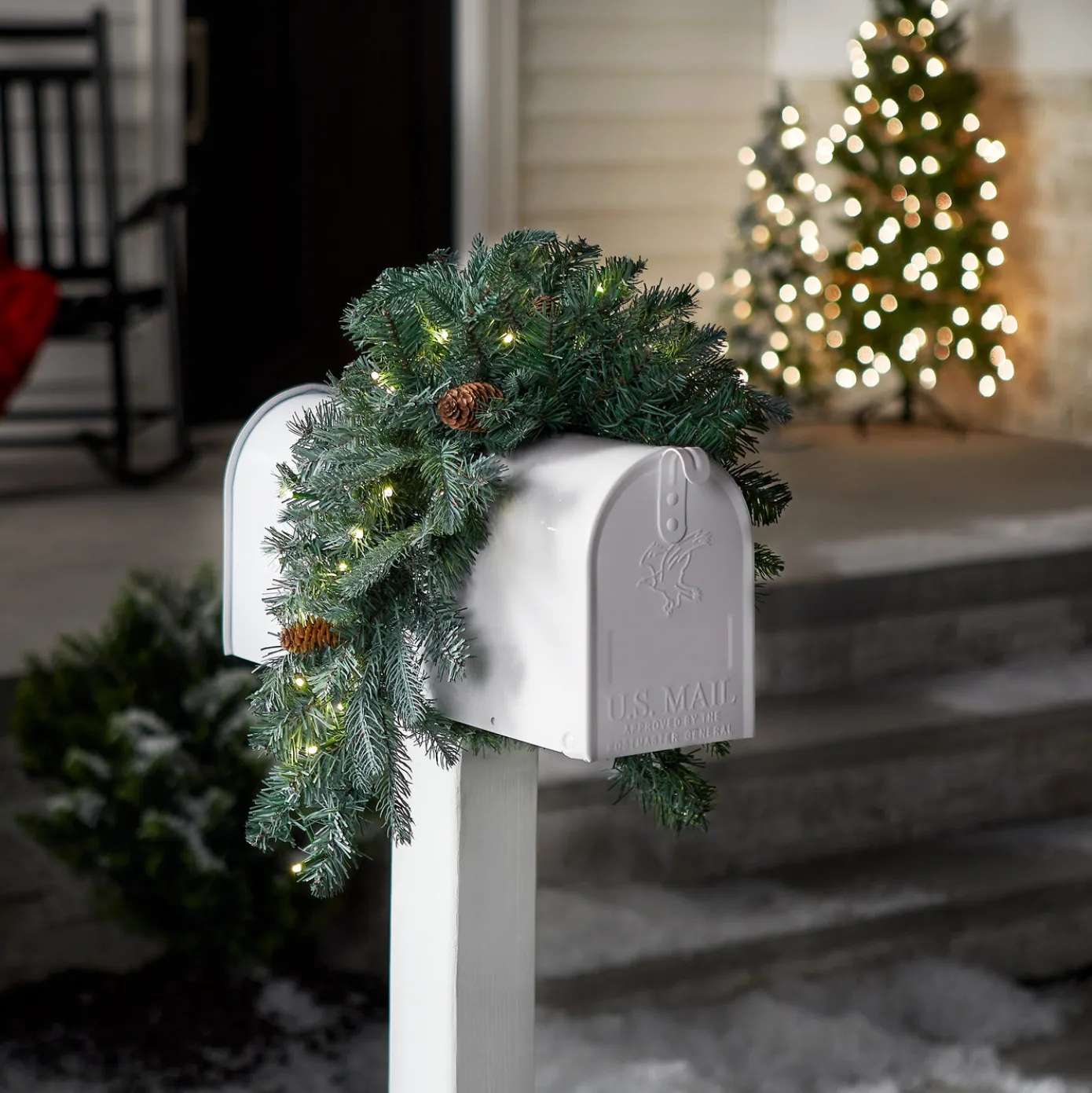 Put a smile on the mailman’s face and all who pass by with this Frosted Arctic Spruce Mailbox Swag. This holiday decoration features Feel Real branch tip technology, creating a decoration with remarkable realism. It is trimmed with pine cones and pre-strung with 35 battery operated warm white LED lights that are energy-efficient and long lasting. 6 hours ON/18 hours OFF timed operation. Includes tie wraps to secure swag to mailbox.