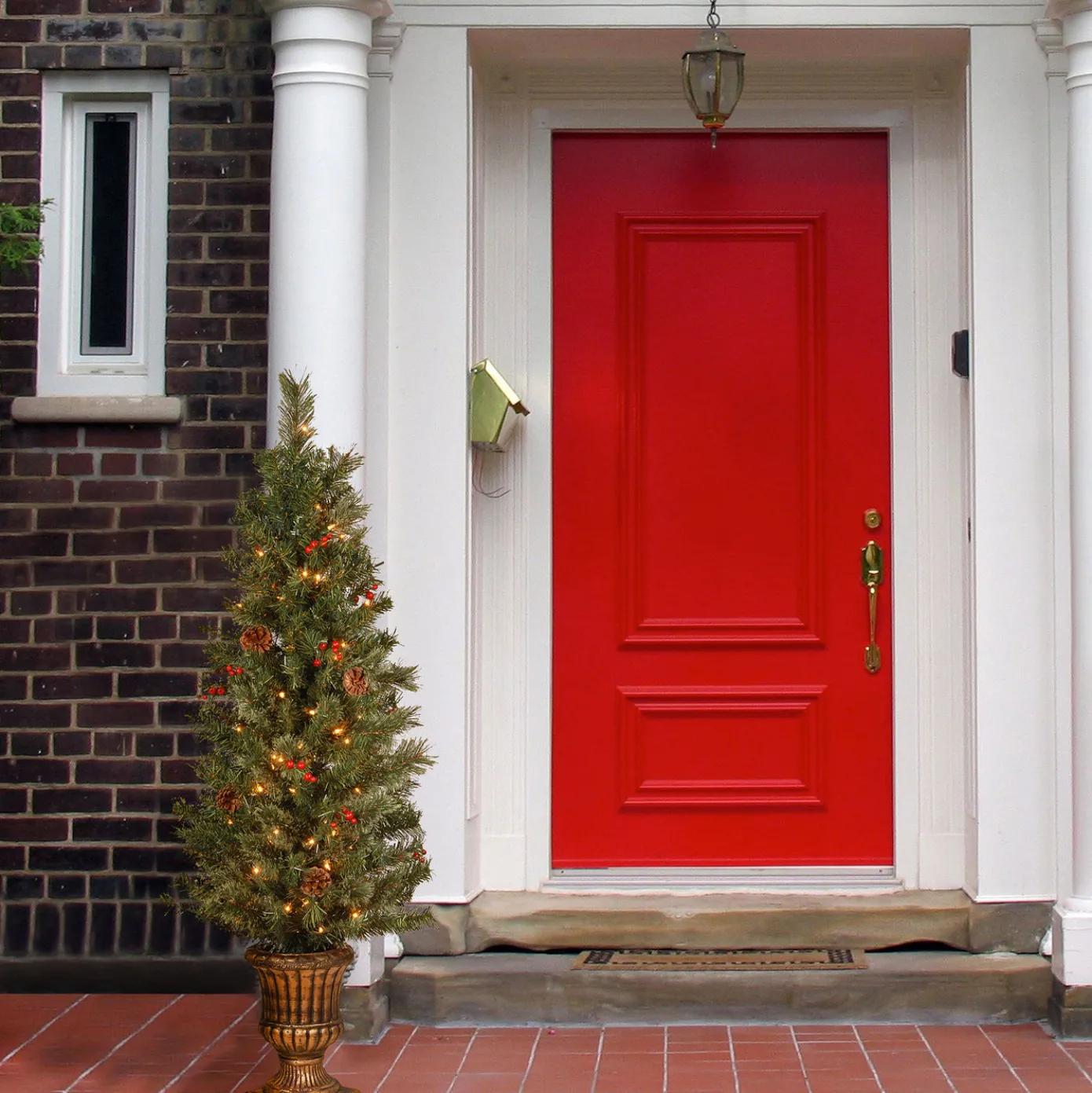 The Montclair Spruce Entrance Tree will add an attractive accent of greenery to doorway, deck, porch or patio. It is pre-strung with 50 clear lights that remain lit even if a bulb burns out, and is seated in a decorative urn base. This realistic planting can be placed in indoor or outdoor locations.