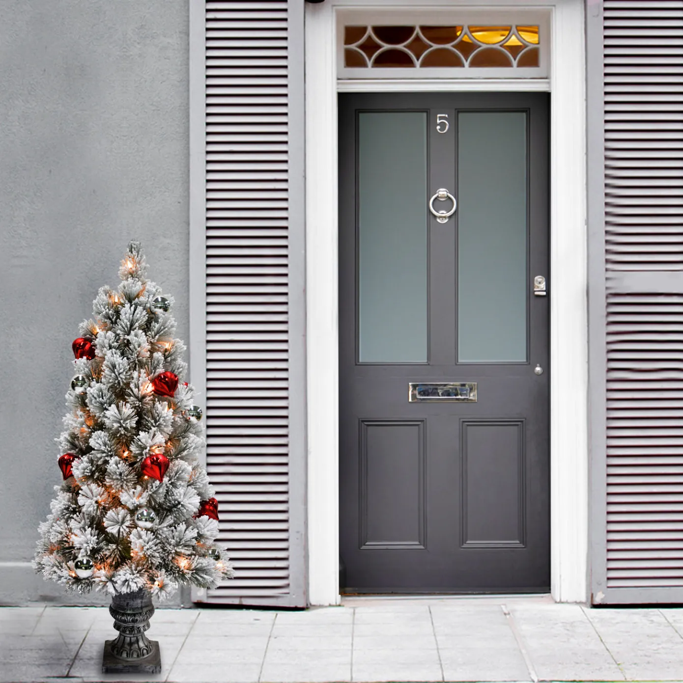The Snowy Bristle Pine entrance tree features wide bristle branch tips sprinkled with snow and trimmed with shiny red and silver ball ornaments. Seated in an attractive urn base, it is pre-strung with 70 clear lights that remain lit even if a bulb burns out. Display this attractive greenery in any indoor or covered outdoor location.