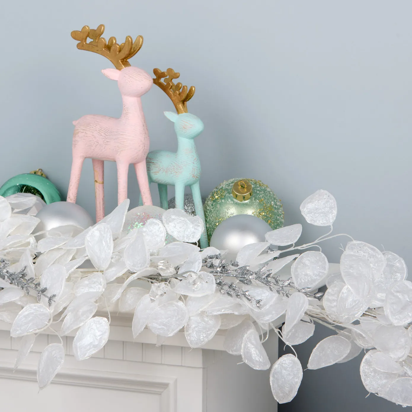 Inspired by a snowy white Christmas, enjoy this gorgeous Winter Frosted White garland. Measuring 4 feet, this stunning white garland is inspired by natures silver dollar with gems. Hang on entryway or mantle to bring a Christmas shimmer to your home. For indoor use only.