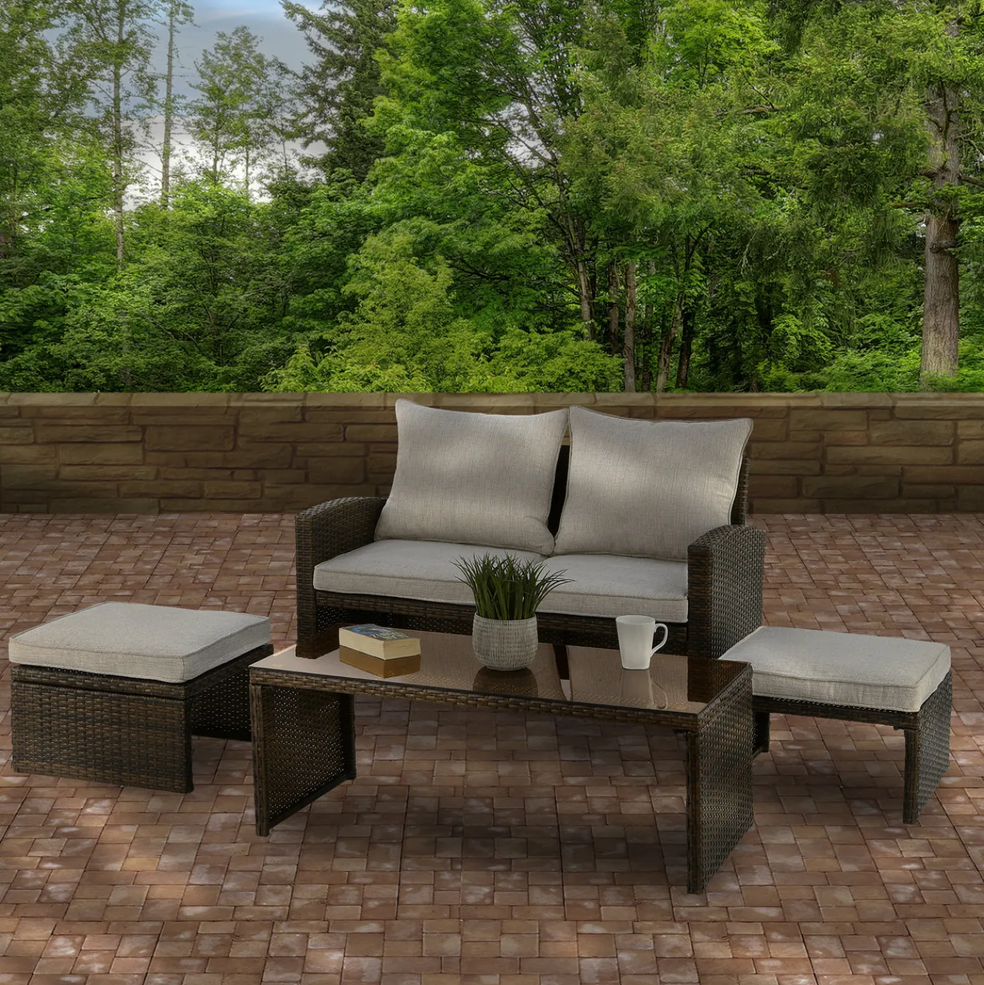 This indoor/outdoor conversation set is constructed with a strong, yet lightweight synthetic PE wicker material wrapped around sturdy powder-coated steel framing. Finished in a wood tone brown color, this contemporary styled set is designed to withstand harsh outdoor elements. Loveseat features thick, soft, comfortable back and seat cushions that are separate and removable, while both ottomans have removeable cushion tops. All cushions are a contrasting beige color fashioned with water, mildew and fade-resistant fabric. Coordinated low profile coffee table includes a 5 mm tempered glass top. The ottomans for this set are designed to slide beneath the table or loveseat when not in use as a space-saving option. Pieces are easy to maintain and care for. Assembly required.