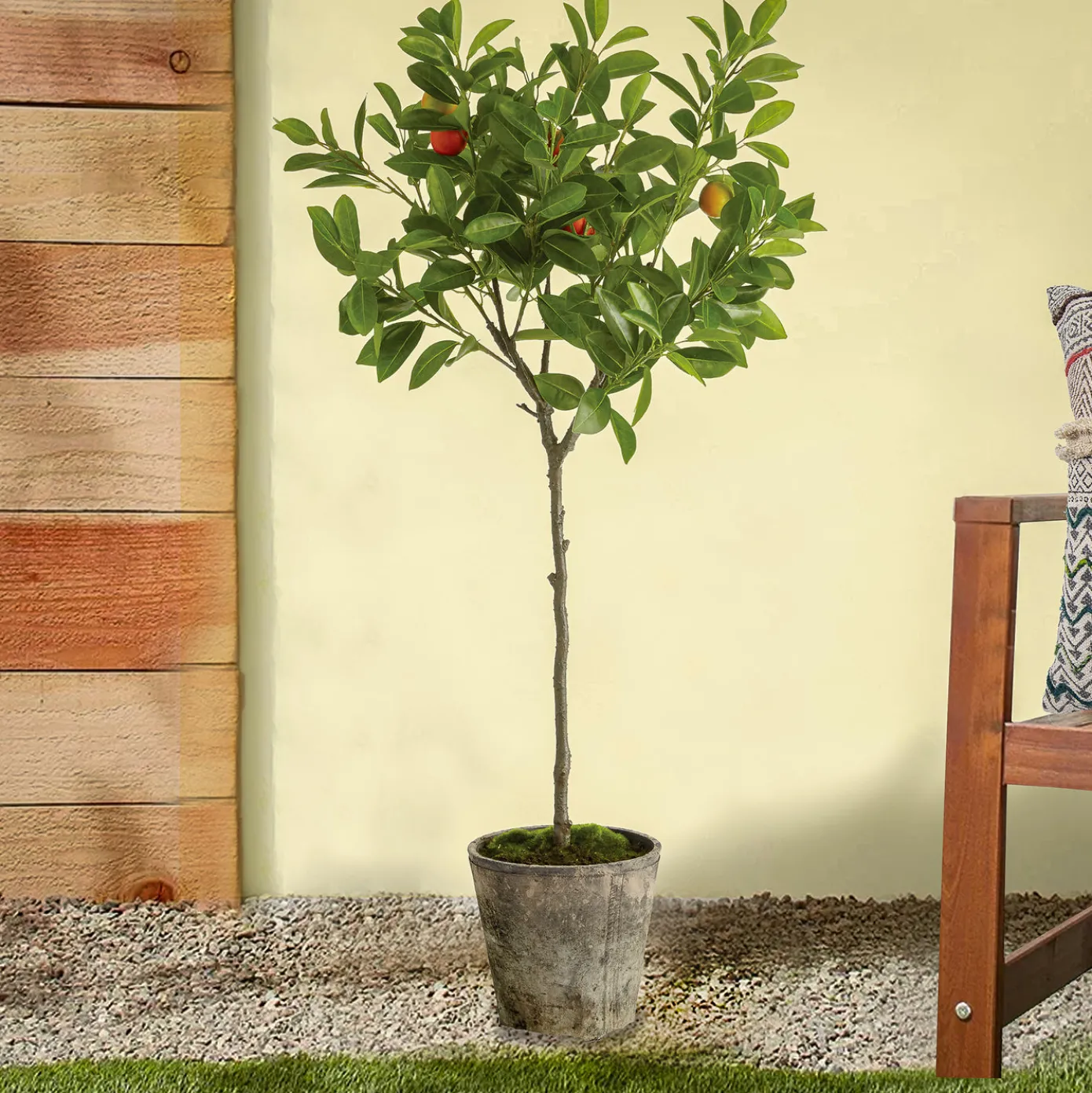 This potted tree features branches of thick flowing leaves with orange fruit sprouting from the top of a tall slender gray bark trunk. It is seated in a sturdy clay pot base with a simulated soil surface. This artificial plant appears life-like yet requires none of the maintenance, water, or sunlight of its living counterpart. Can be displayed in indoor or covered outdoor locations.