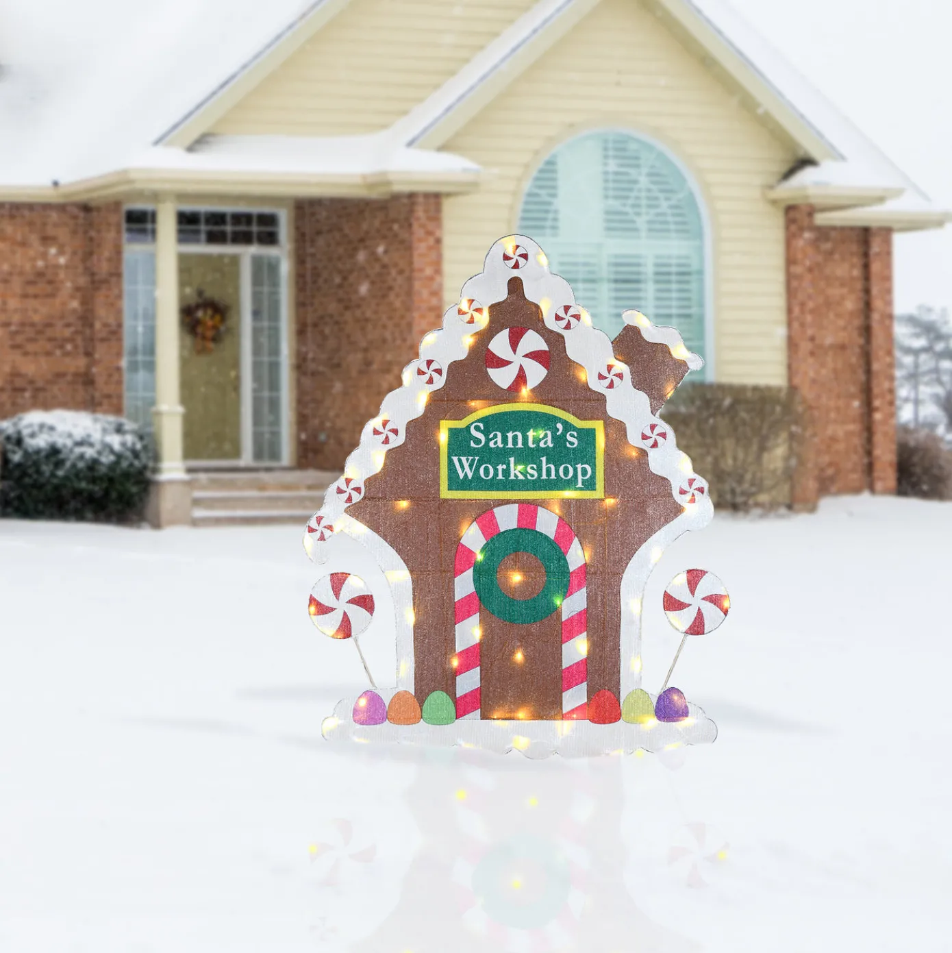 - Includes one 42 inches in height Gingerbread House that reads “Santa’s Workshop”. To power the lights, simply plug in to the nearest wall outlet