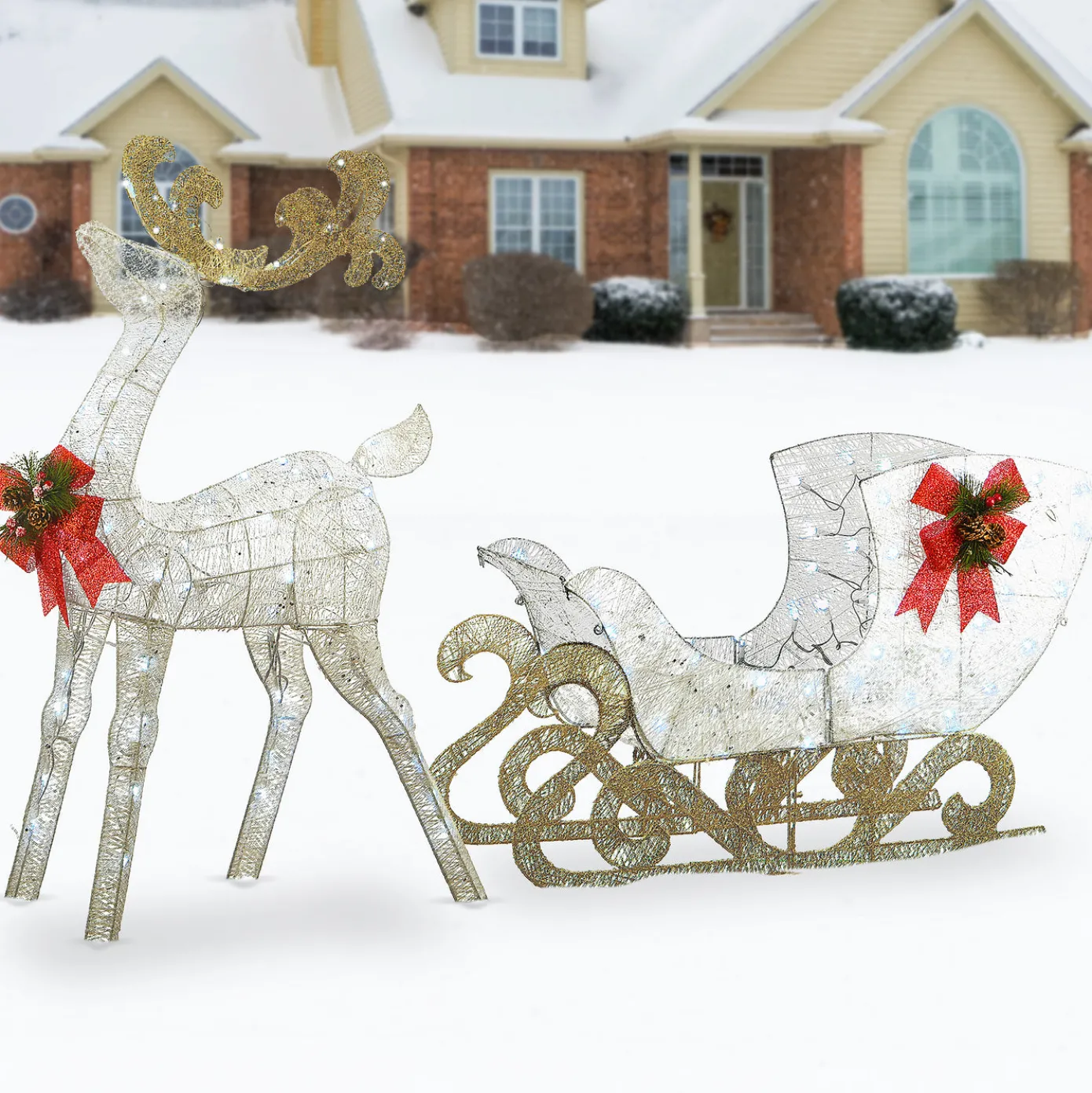 This stunning 48 inch crystal splendor white sisal reindeer paired with a 38 inch sleigh is a captivating centerpiece for your holiday décor! Adorned with gold accents, vibrant red bows, red berries, and pine cones, it exudes festive charm. With 140 cool white LED lights, this enchanting display sparkles beautifully, creating a magical winter wonderland vibe. Perfect for both indoor and outdoor settings, it’s sure to bring holiday joy to your home!