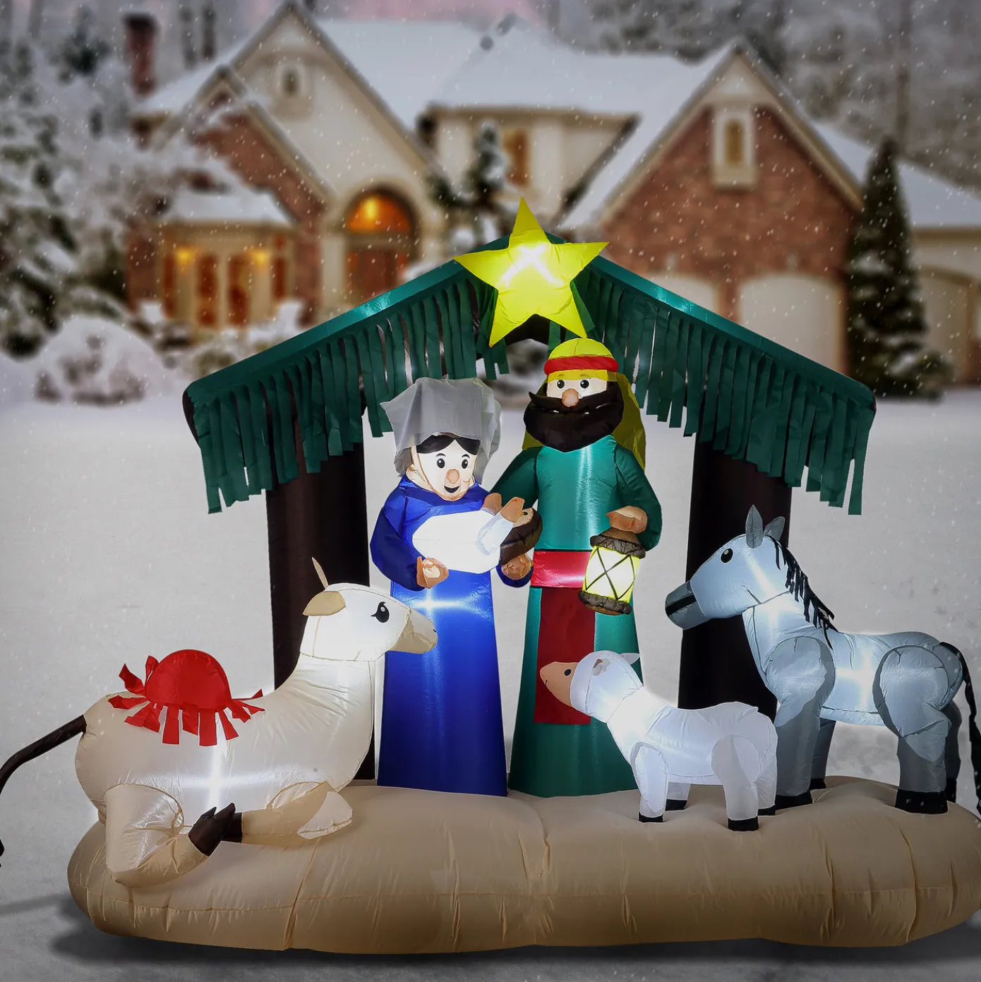 This 6.5 foot inflatable nativity scene is a beautiful and meaningful addition to your holiday decor! With 13 warm white LED lights, it will create a serene and inviting glow, perfect for celebrating the season’s true spirit. You can position it prominently in your yard, perhaps as a centerpiece or near your entrance to invite reflection and joy. It self inflates in seconds and includes ground stakes and tethers for easy outdoor setup.
