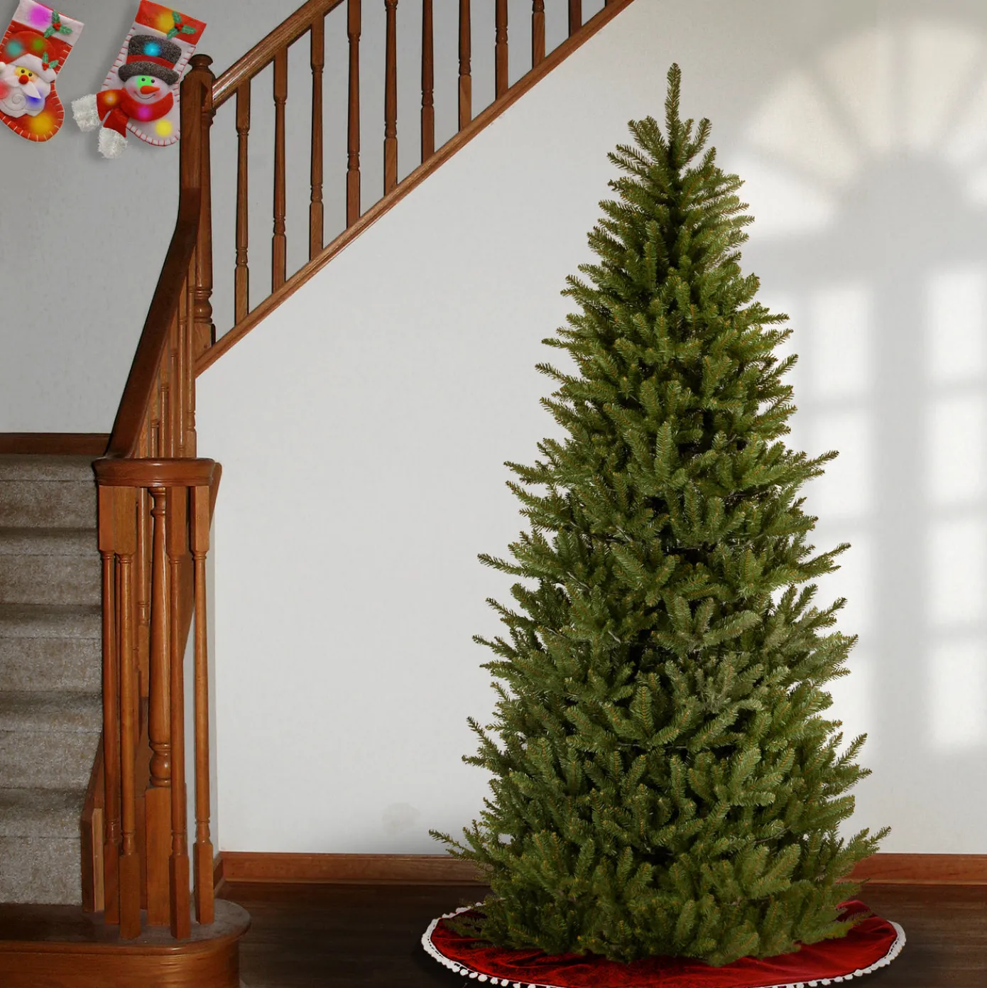 This Natural Fraser Fir tree features a slim profile that may be a better fit for corners or areas with limited space. This tree features hinged branch construction for ease of assembly. Sturdy metal tree stand is included.