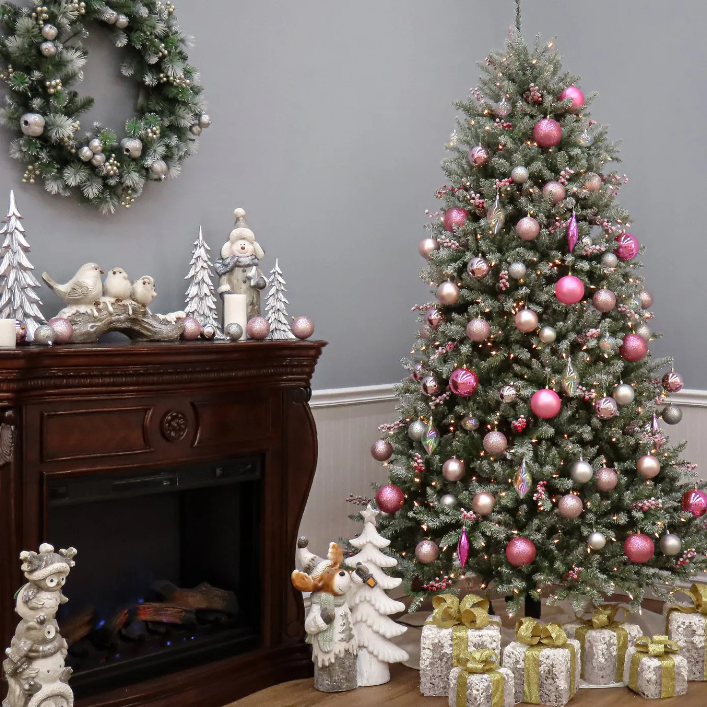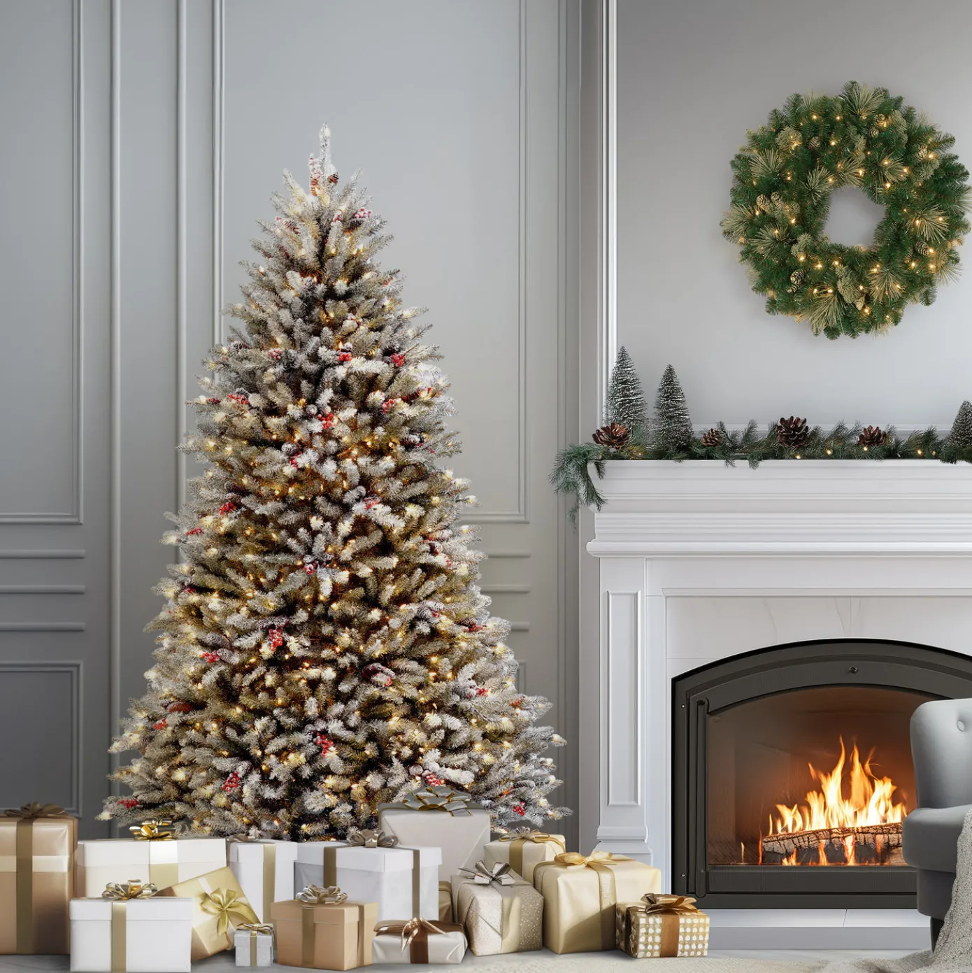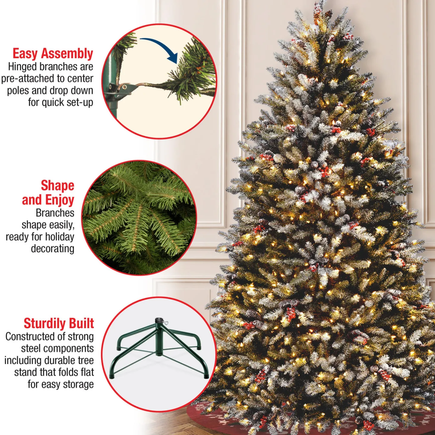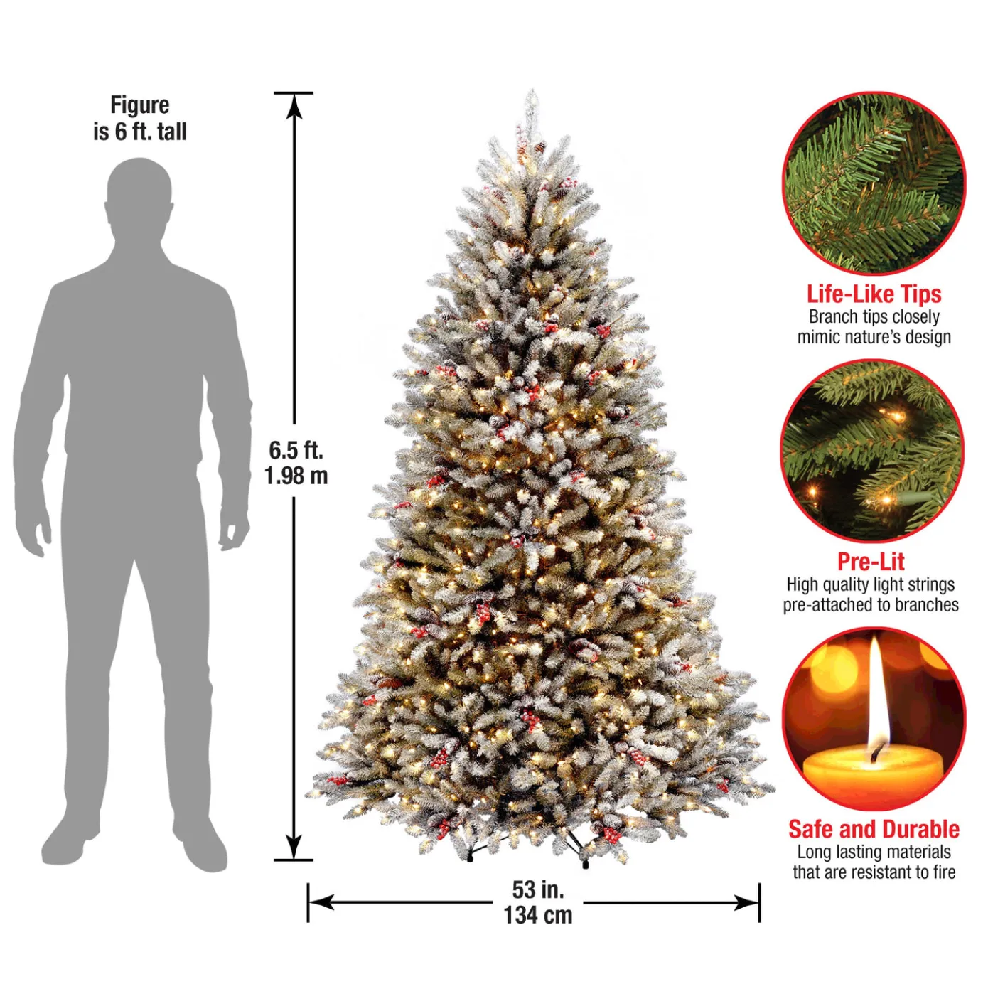 The Dunhill Fir features tightly packed branches sprinkled with snow. It is trimmed with red berries and pine cones and is pre-strung with 650 clear lights that remain lit even if a bulb burns out. The hinged branch construction of this three section tree adds to ease of assembly. Sturdy folding metal tree stand is included.