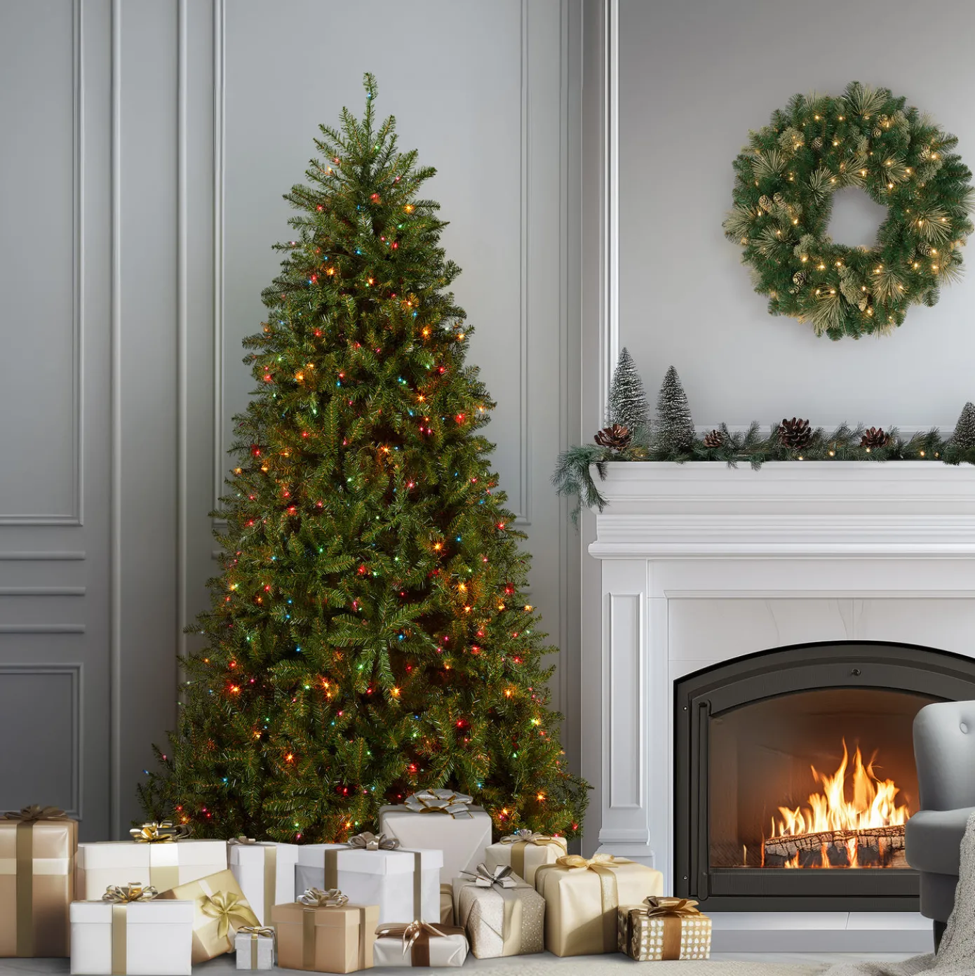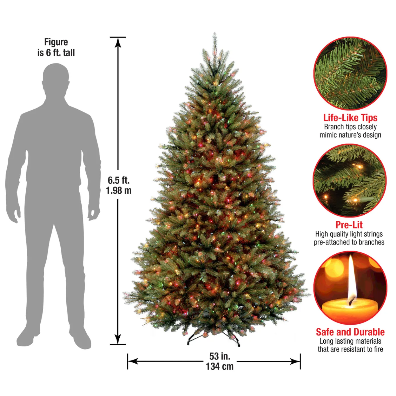 The Dunhill Fir is a full body tree featuring a generous number of branch tips for holding holiday trimmings. It is pre-strung with 650 multicolor lights that remain lit even if a bulb burns out. This tree features hinged branch construction for ease of assembly. Sturdy metal tree stand is included.