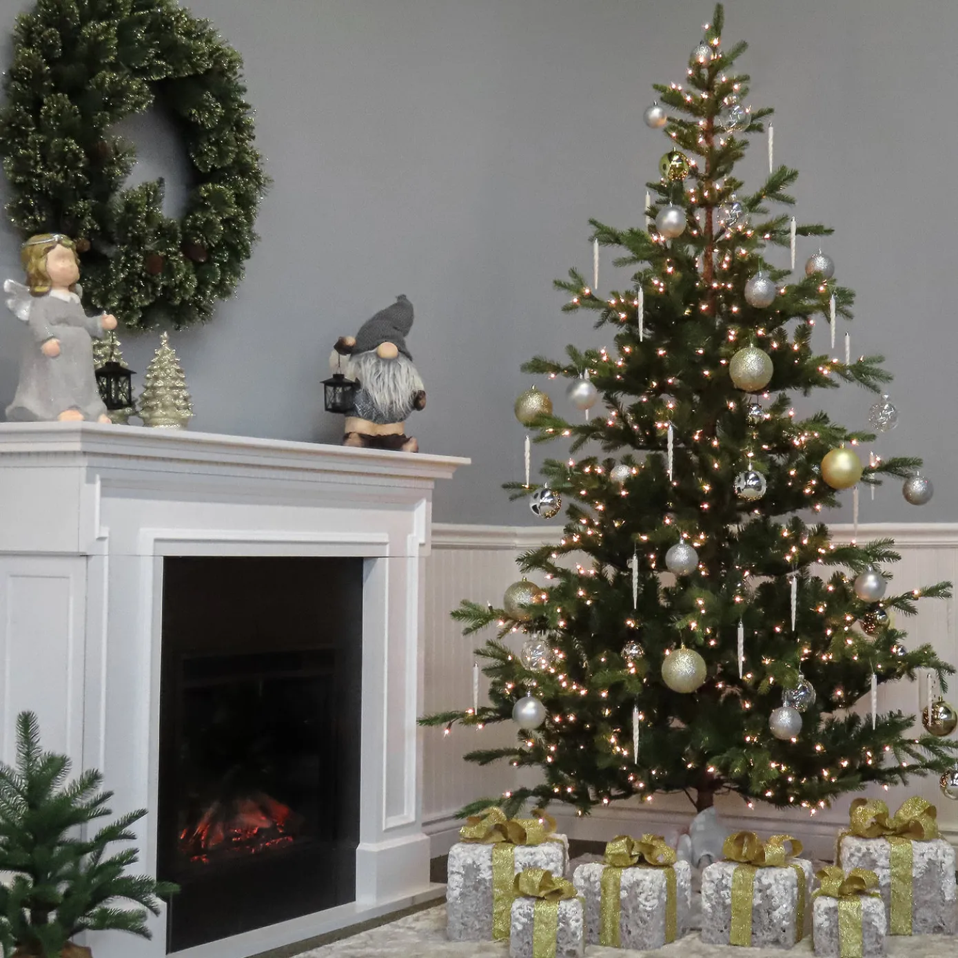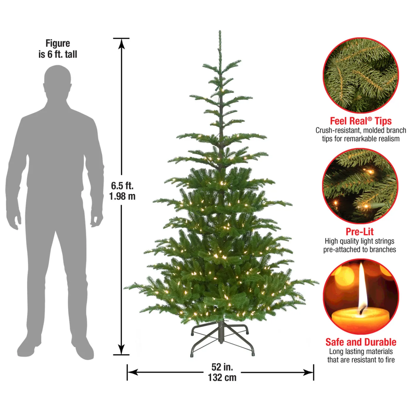 This Norwegian Spruce tree features Feel Real branch tip technology, creating a tree with remarkable realism. These crush-resistant branch tips are molded from real tree branches for an authentic living tree appearance. This tree has a traditional cone shape with upswept branch design and is pre-strung with 650 clear lights that remain lit even if a bulb burns out. This tree features hinged branch construction for ease of assembly. Sturdy metal tree stand is included.