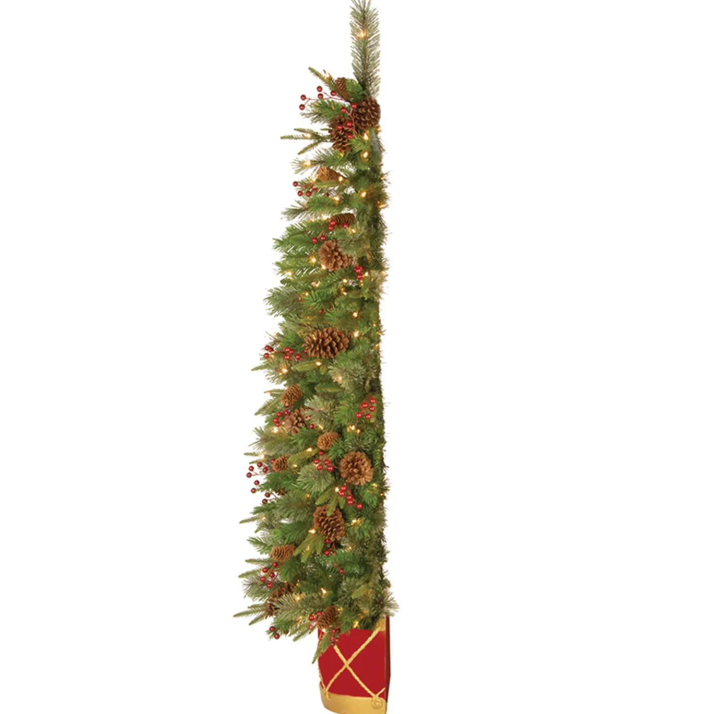 This Colonial Slim Half Tree features a flat backside designed for display against a wall or where floor space is limited. It also features Feel Real branch tip technology, creating a tree with remarkable realism. It is pre-lit with 200 clear lights and trimmed with red berries and pinecones. A bright red and gold simulated drum base adds the finishing touch to this attractive holiday decoration.