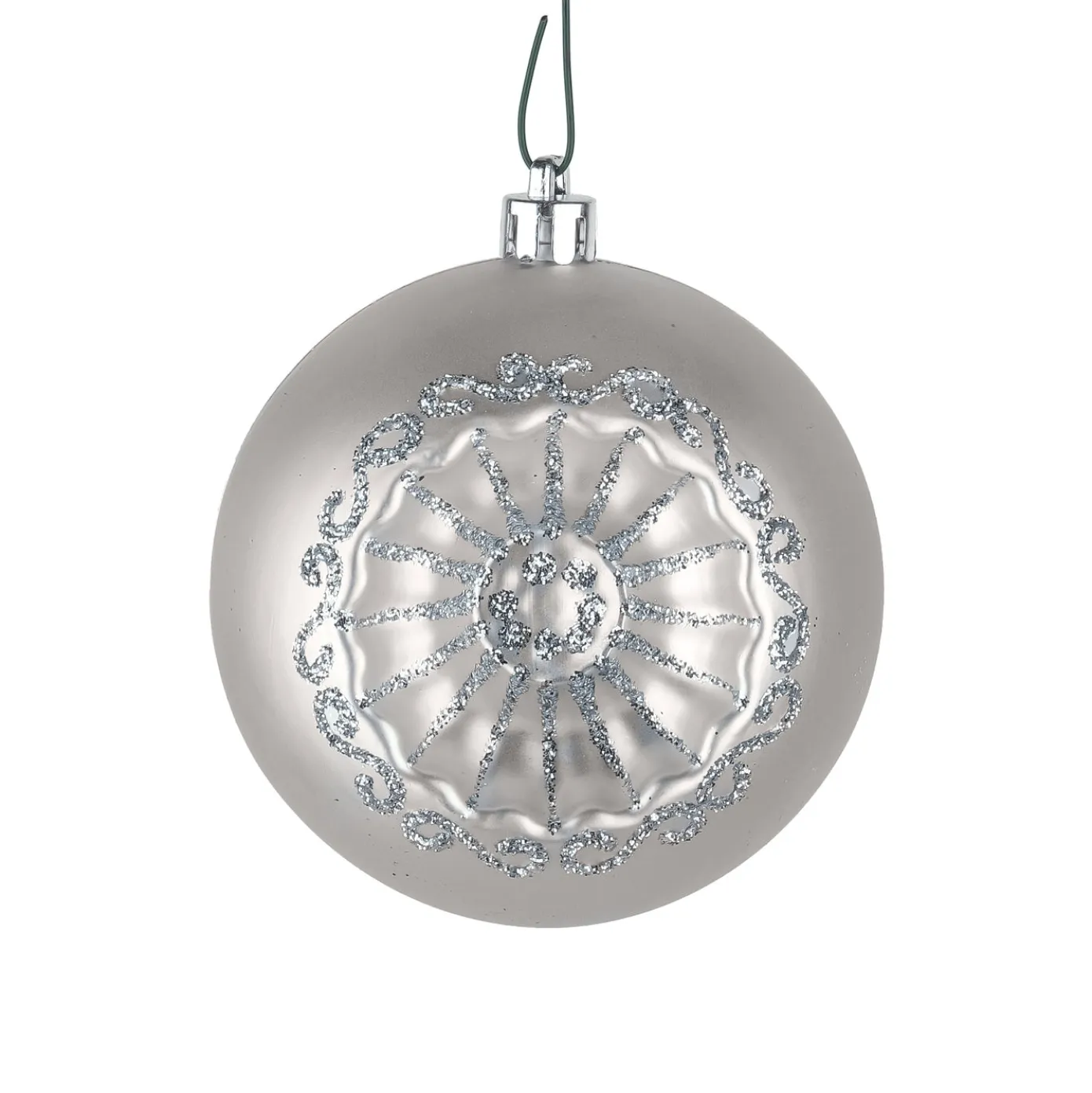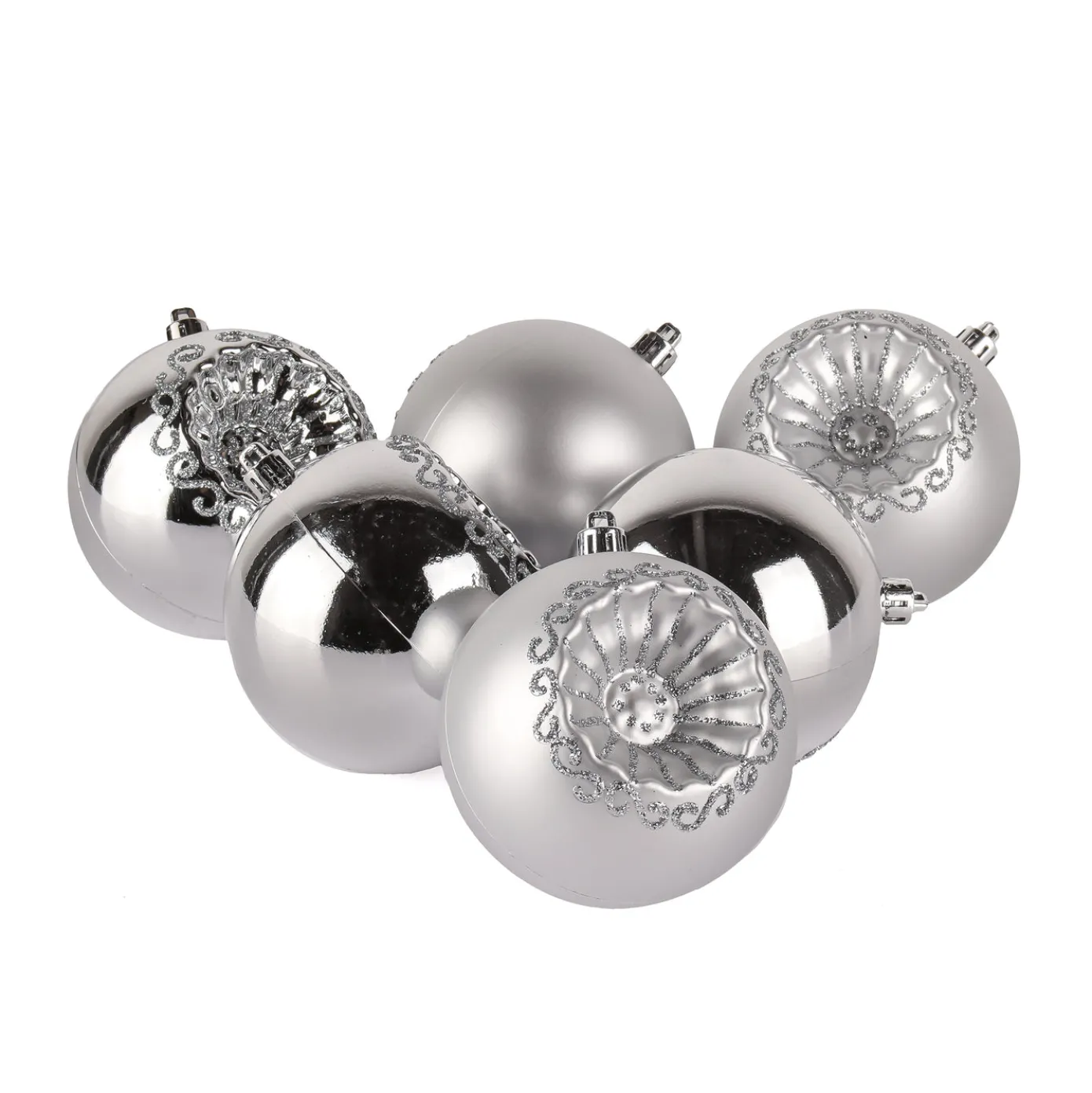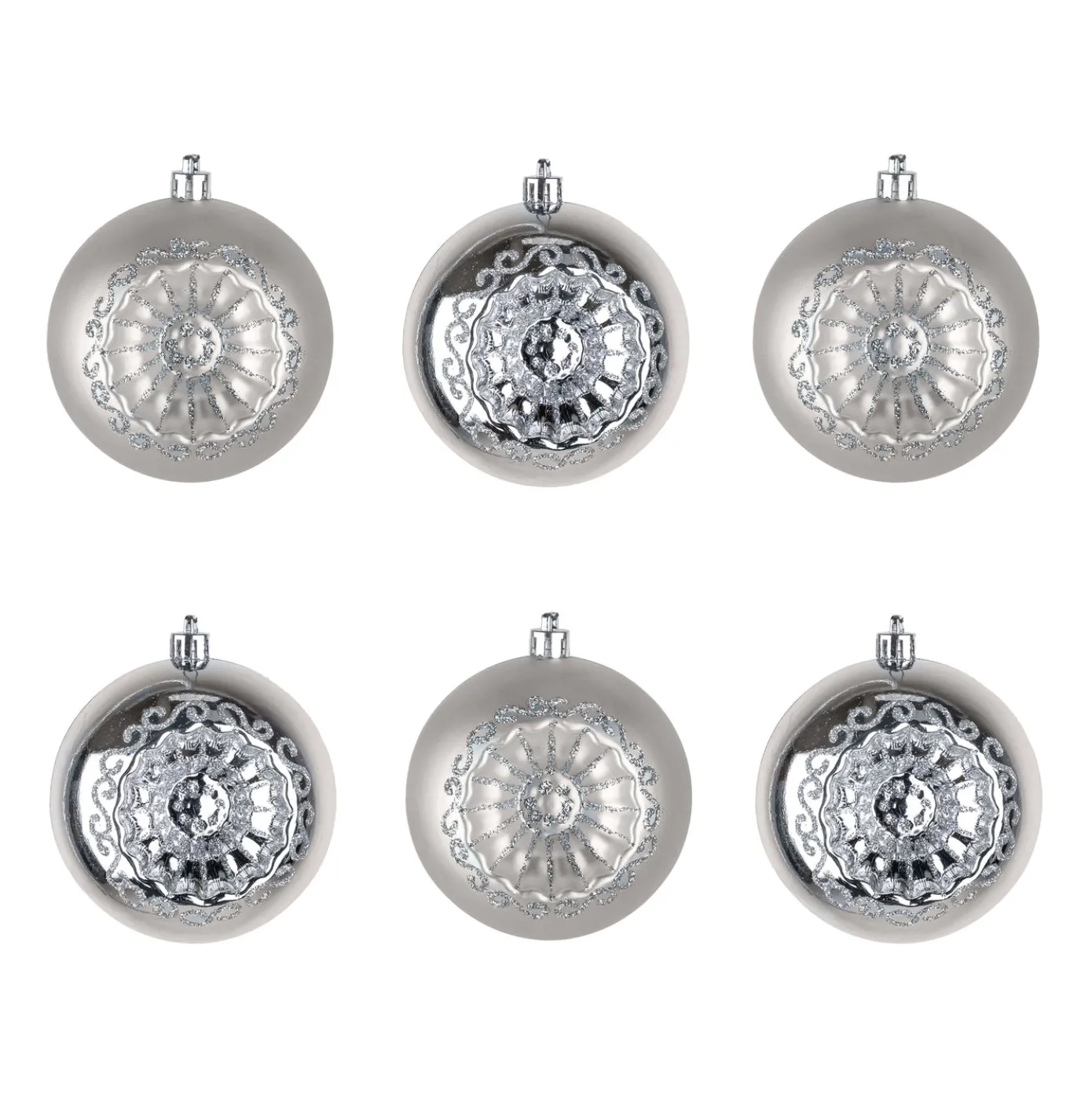This set consists of six silver color ball ornaments that feature a recessed design with ornate silver-sparkled trimmings. Included are ornaments in both gloss and matte finishes, all constructed of lightweight and shatterproof polystyrene material. This set is elegant and perfect for adding a touch of shimmer to your holiday decor! The silver color will complement a variety of color schemes, making them versatile for any festive display.