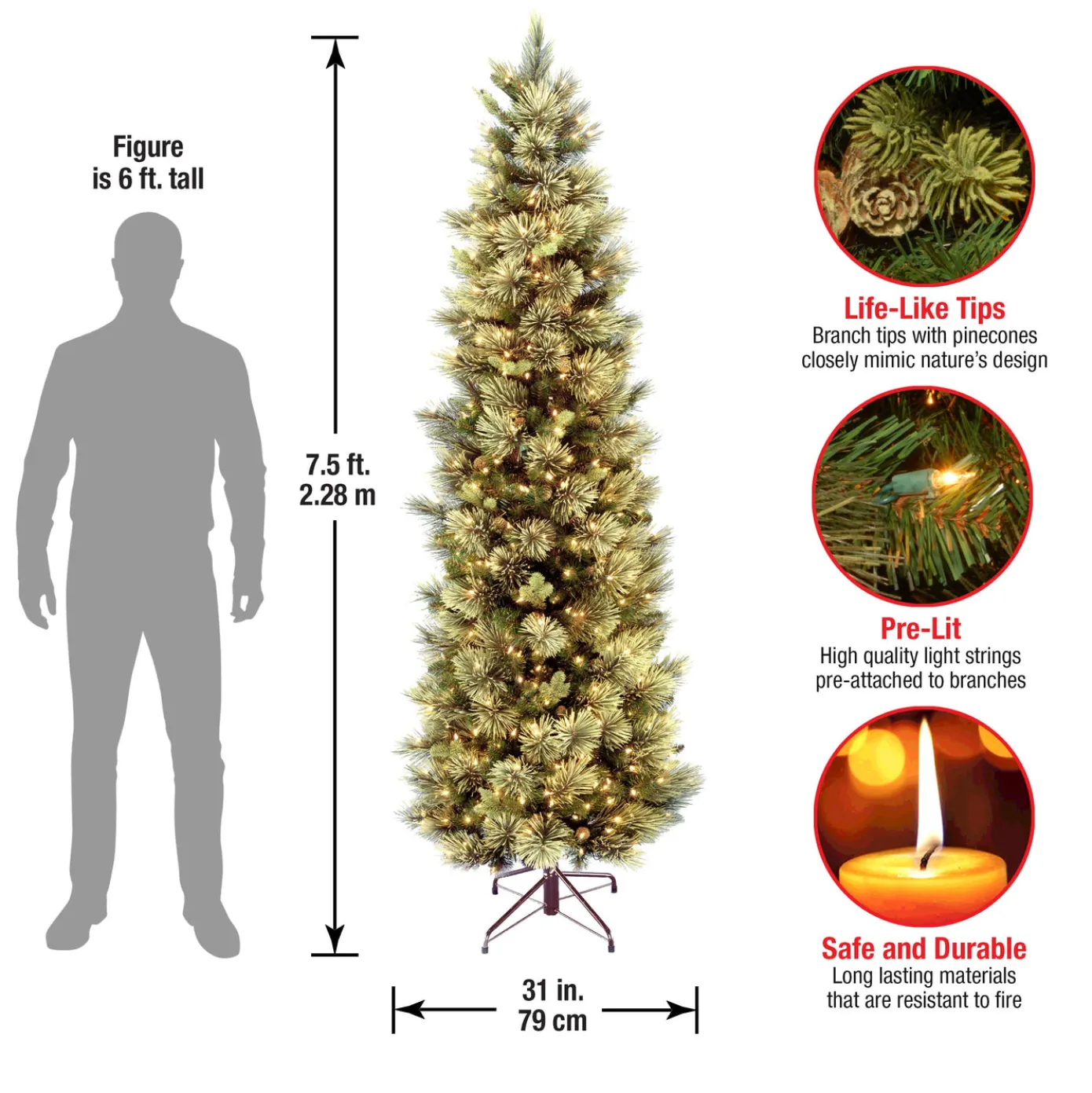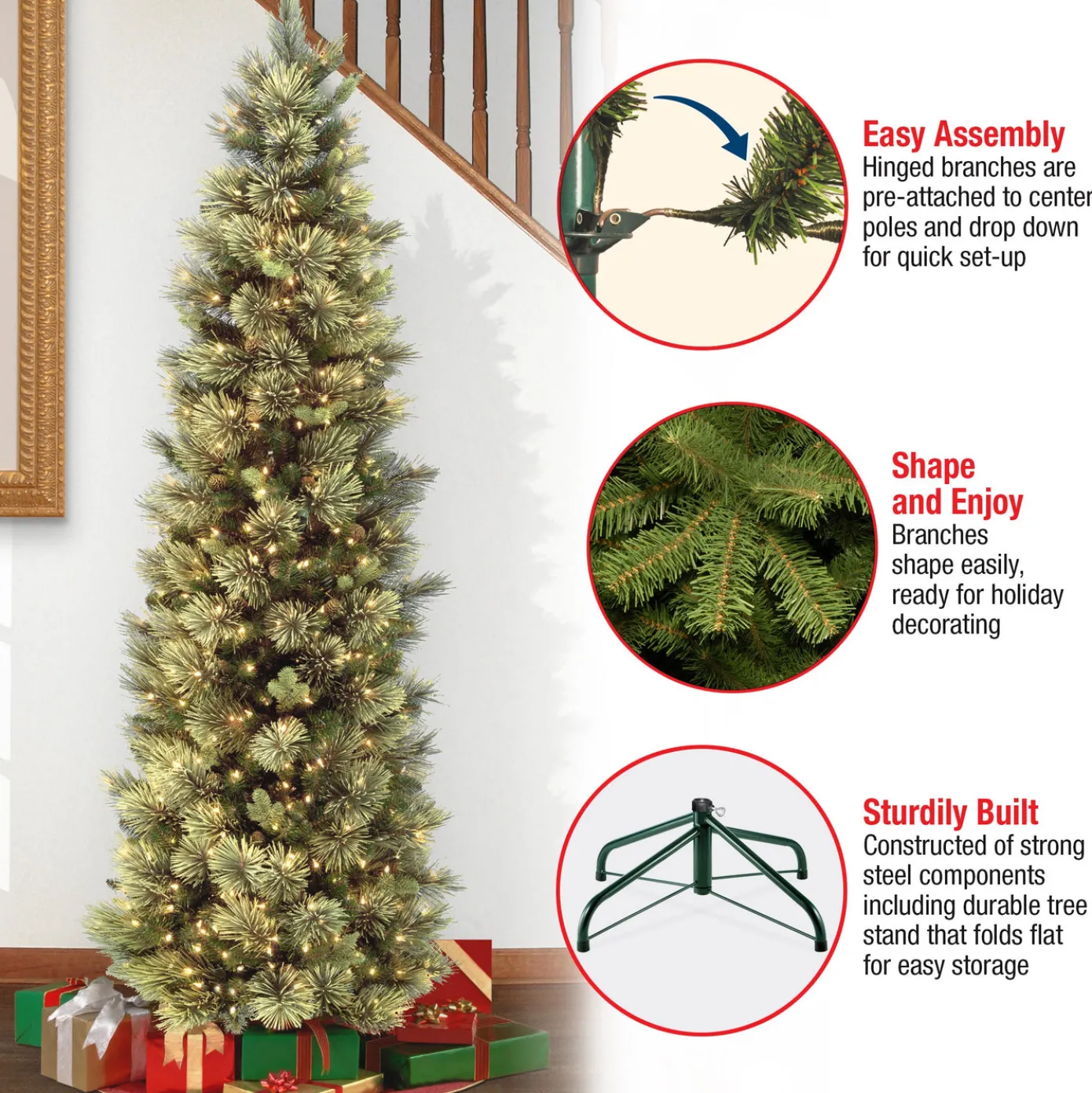This Carolina Pine tree offers a slim profile tree that is great for display in corners, small rooms and areas with limited space. It features mixed bristle and cashmere branch tips for an overall softer appearance. It is trimmed with pinecones for added natural appeal and is pre-strung with 600 clear lights that remain lit even if a bulb burns out. This tree features hinged branch construction for ease of assembly. Sturdy folding metal tree stand is included.