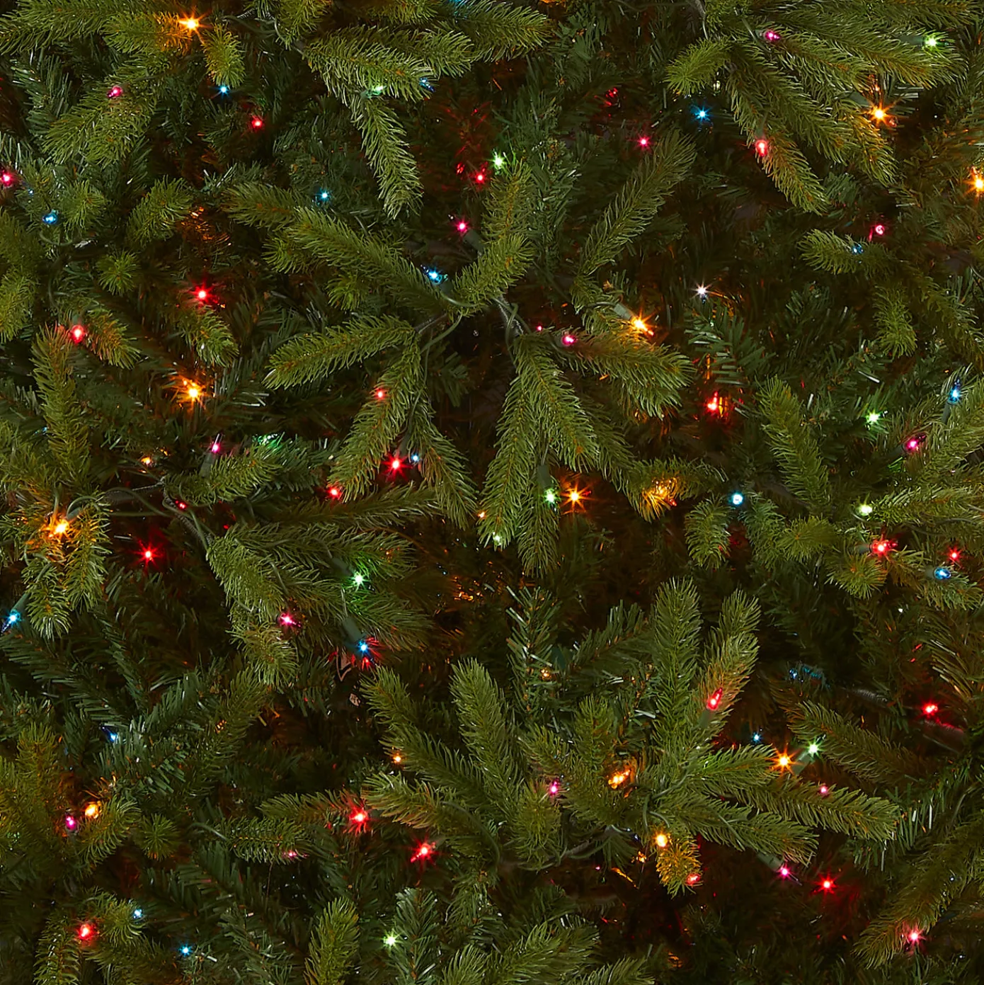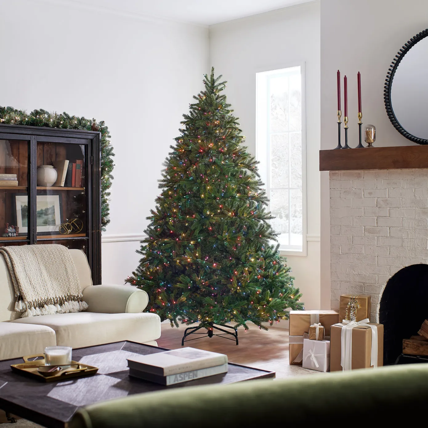 This Jersey Fraser Fir tree features Feel Real branch tip technology, creating a tree with remarkable realism. These crush-resistant branch tips are molded from real tree branches for an authentic living tree appearance. This full-bodied tree is pre-strung with 1250 multicolor lights that remain lit even if a bulb burns out. This tree features hinged branch construction for ease of assembly. Sturdy metal tree stand is included.
