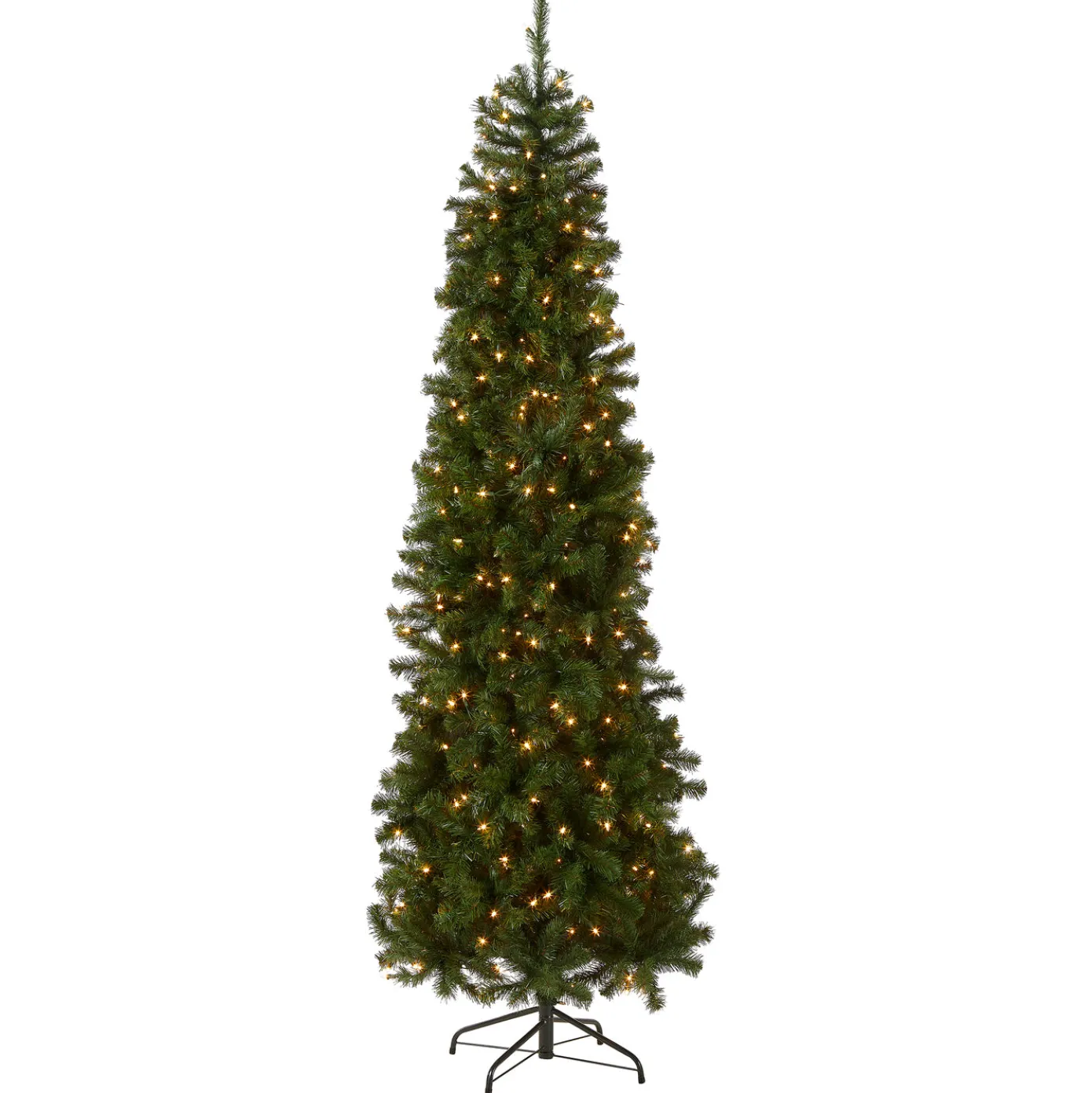 The North Valley Spruce Pencil Slim tree offers a slim profile tree that is great for display in corners, small rooms and areas with limited space. It is pre-strung with 400 clear lights that remain lit even if a bulb burns out. This tree features hinged branches for ease of assembly. Sturdy folding metal tree stand is included.