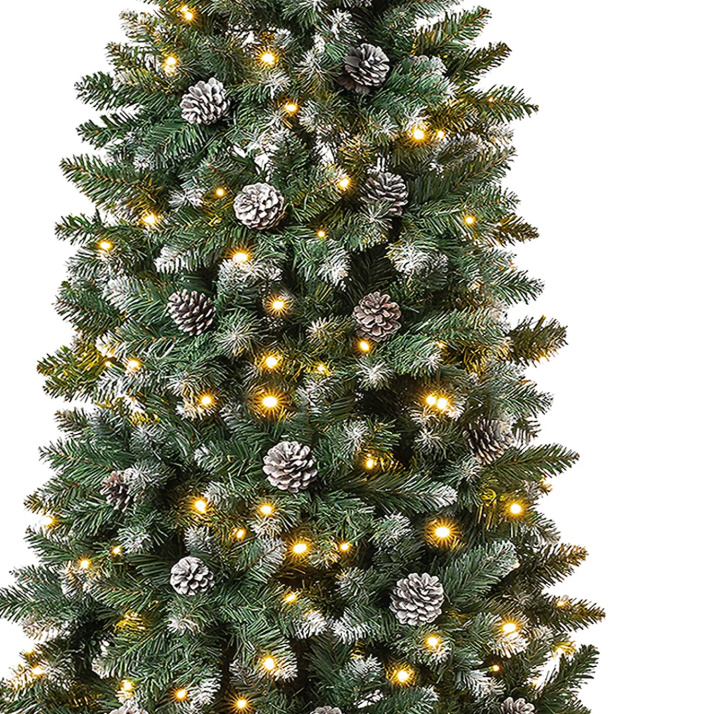 This Oakley Hill Snow tree features flocked branches and pinecones giving the appearance of freshly fallen snow. It is pre-strung with 350 warm white LED lights that remain lit even if a bulb burns out. The slim profile of this tree may be a better fit for corners or areas with limited floor space. This tree features hinged branches for ease of assembly. Sturdy folding metal tree stand is included.