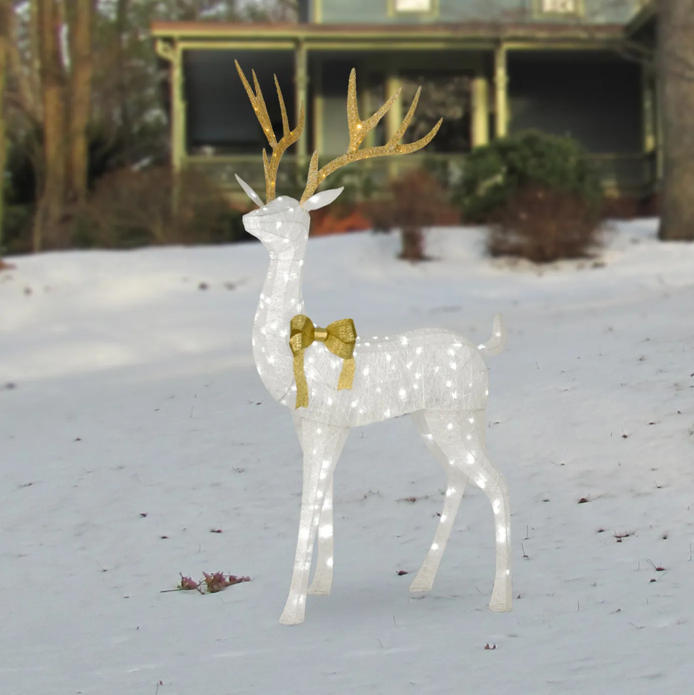 This majestic standing Buck is made with glittered rigid sisal material wrapped around a wire frame, for an attractive decoration that is strong and durable. The combination of the glittering material and the twinkling lights creates a magical ambiance, adding a touch of enchantment to your festive decor. It is pre-lit with 160 cool white twinkling LED lights that sparkle and shine. This seasonal trimming features a bright white color with contrasting gold antlers and gold ribbon bow embellishment. For indoor or outdoor display.