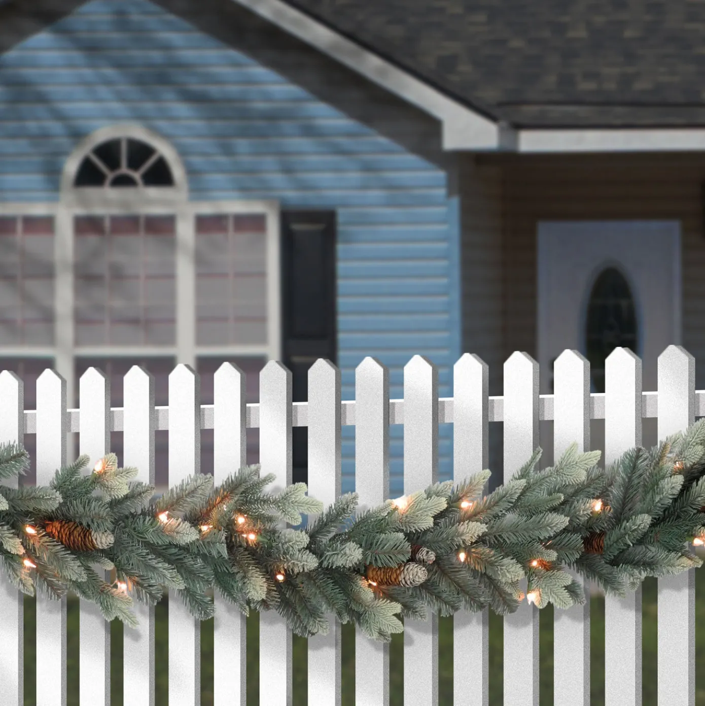The Copenhagen Spruce garland features Feel Real branch tip technology, creating a decoration with remarkable realism. These crush-resistant branch tips are molded from real tree branches for an authentic appearance. It is a mixed tip garland that is trimmed with flocked pine cones and is pre-lit with 50 clear lights that remain lit even if a bulb burns out. This garland can be displayed over doors, windows, fireplace mantels, fence or stairway railings. For indoor or covered outdoor use.