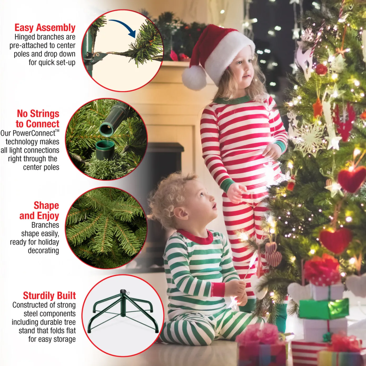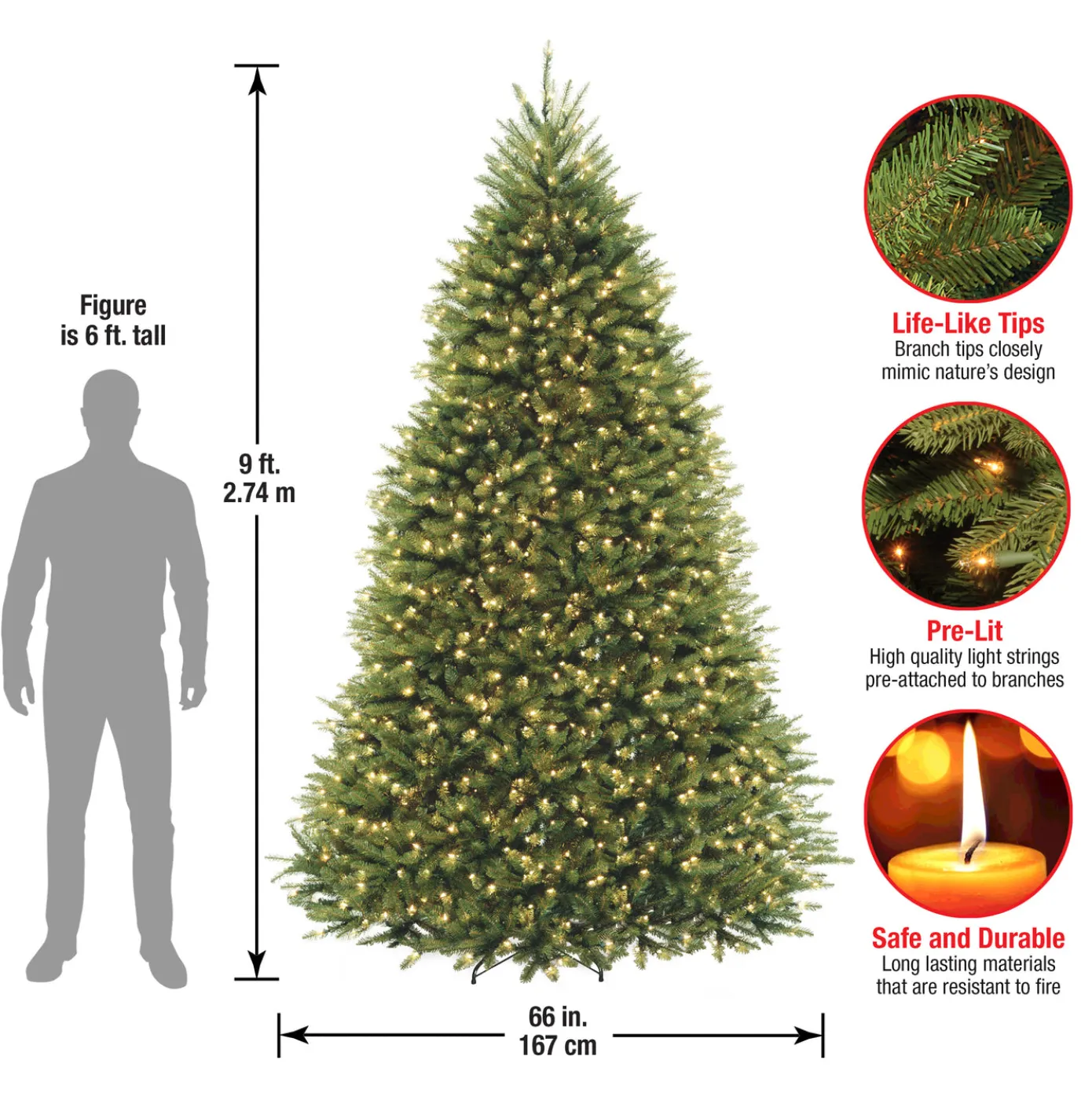 This Dunhill Fir tree features the PowerConnect through-the-pole lighting system that eliminates the need for connecting multiple light strings. This full body tree features a generous number of branch tips for holding holiday trimmings. It is pre-strung with 900 clear lights that remain lit even if a bulb burns out. This tree features hinged branch construction for ease of assembly. Sturdy metal tree stand is included.