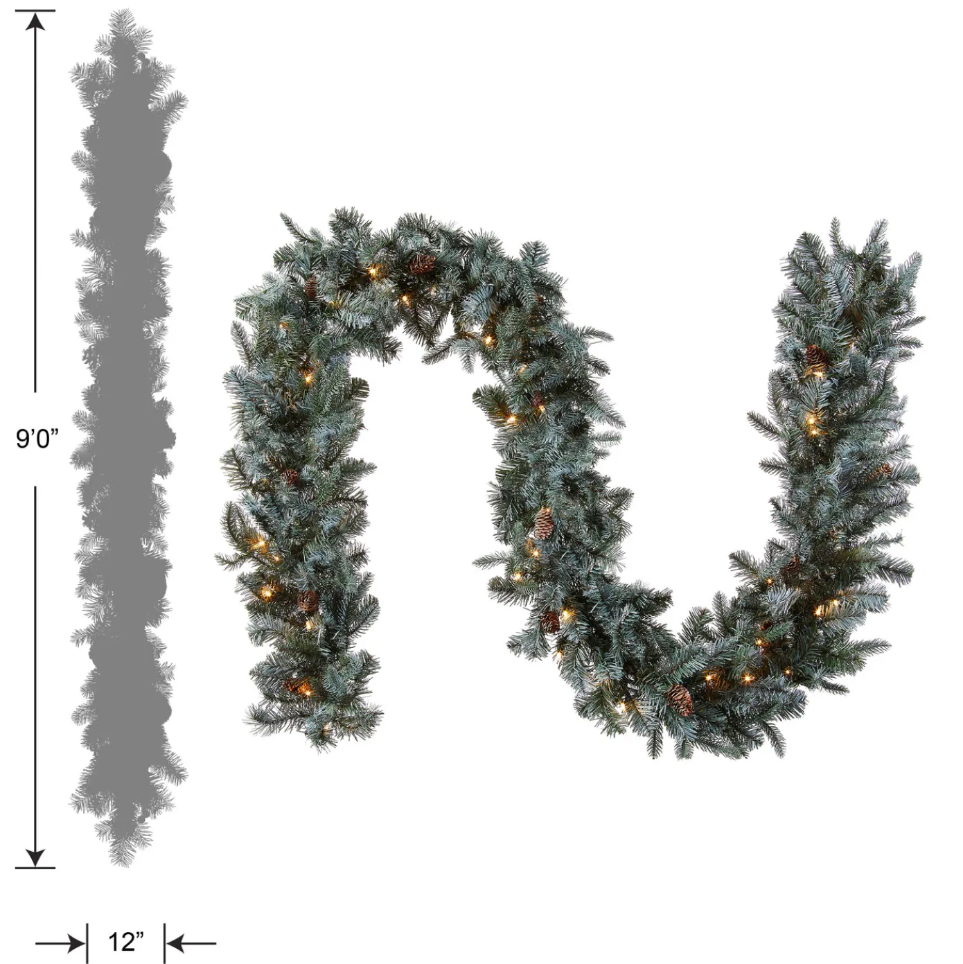 The Frosted Arctic Spruce garland features Feel Real branch tip technology, creating a decoration with remarkable realism. These crush-resistant branch tips are molded from real tree branches for an authentic appearance. This garland is trimmed with pine cones and pre-strung with 50 clear lights that remain lit even if a bulb burns out. This indoor,outdoor garland can be displayed over doors, windows, fireplace mantels, fence, or stairway railings.