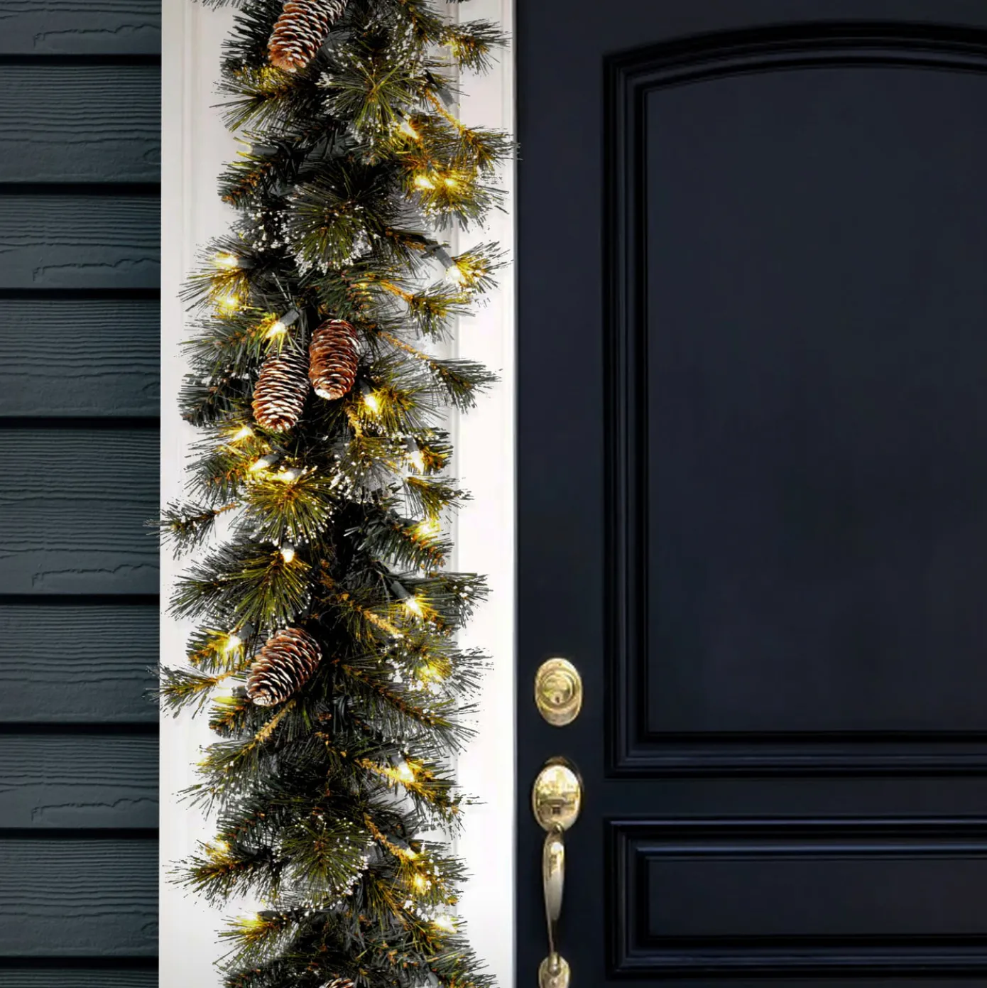 The Glittery Pine is a mixed branch garland with snow and sparkled tips. This garland is trimmed with snow-tipped pine cones and glittery bristle. It is pre-lit with 100 clear lights that remain lit even if a bulb burns out. This garland can be displayed over doors, windows, fireplace mantels, fence, or stairway railings. For indoor or outdoor display.