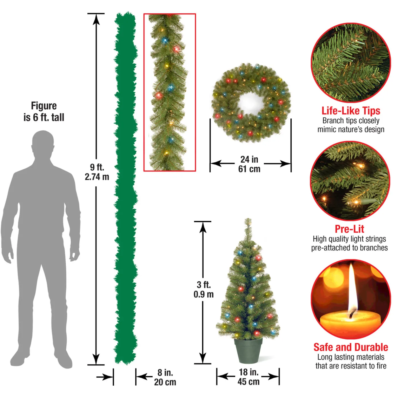 This promotional assortment features two 3-foot entrance trees in green planter pots, each equipped with 35 multicolor LED lights, perfect for welcoming guests with festive cheer. It also includes a 9-foot garland adorned with 50 multicolor LED lights and a 24-inch wreath with 35 multicolor LED lights. All pieces are battery-operated and come with a convenient timer, making it easy to brighten your holiday decor effortlessly. This vibrant assortment adds a joyful and colorful touch to your seasonal celebrations!