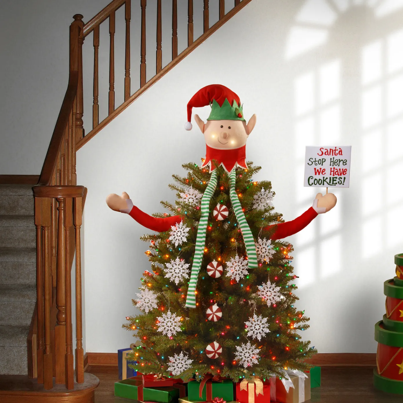 The Elf Tree Dress Up Kit a fun and festive way to decorate your tree! It adds a playful touch that’s perfect for the holiday spirit. Included is a round poly-foam Elf head sporting a red cap and collar with a long flowing green and white striped neck scarf. Two arms in red sleeves extend out with a sign to Santa in one hand. Four candy ornaments serve as buttons and twelve snowflakes are included for added decoration. This cheerful kit can be used on both real or artificial trees. For indoor use only.